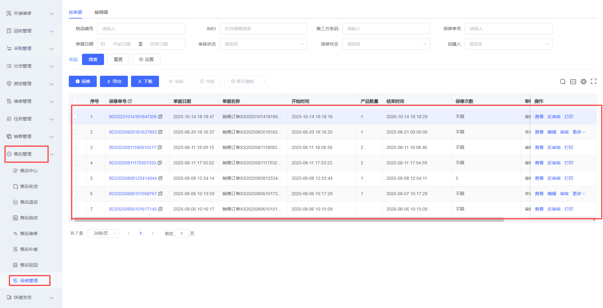 保修管理全部信息查看列表(分按单据、按明细展示)