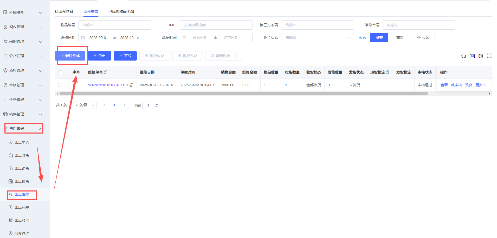 2、确定保修直接新建售后维修单据进行维修以及出入库操作,如下图所示: