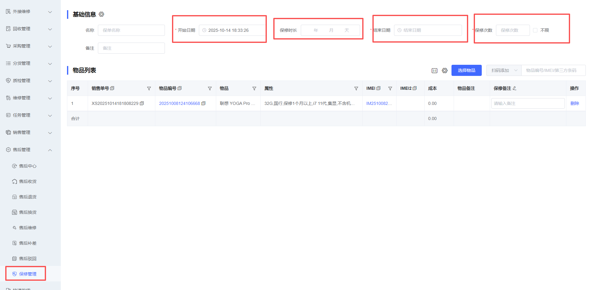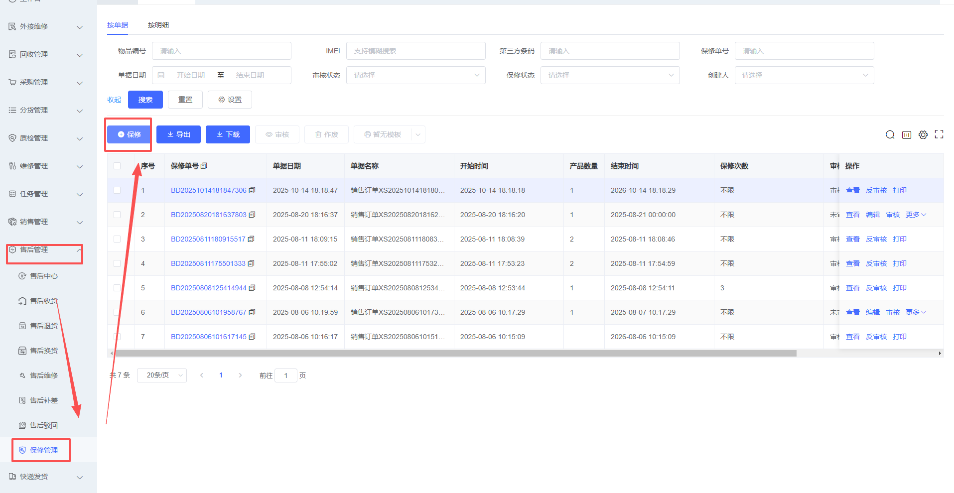 注意事项:保修管理只做保修信息登记记录以及查询,需要出入库管理以及维修,在对应售后维修处处理业务单据