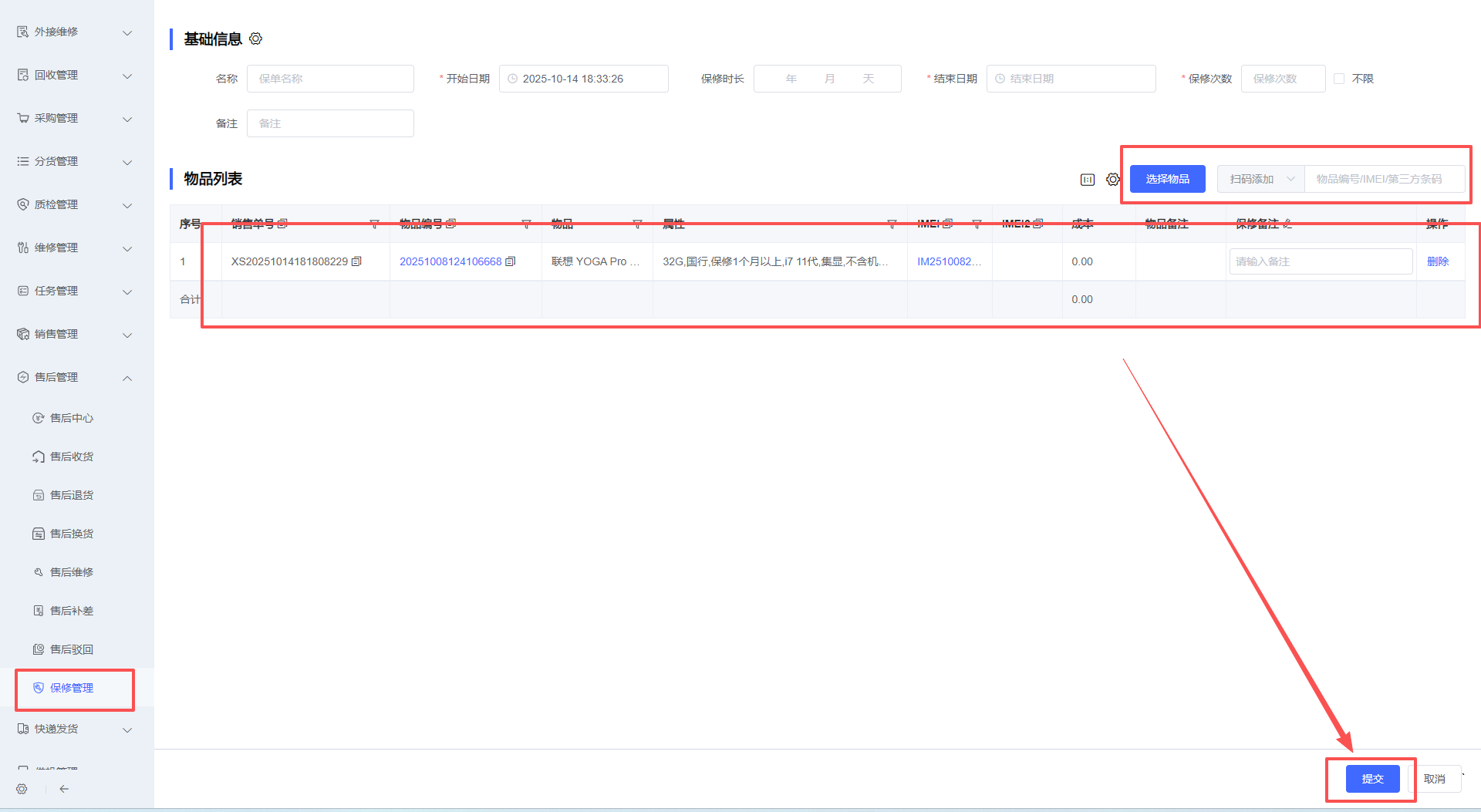5、维护完成基本信息,维护产品信息,选择物品信息--无问题点击提交即可完成保修信息创建,如下图所示: