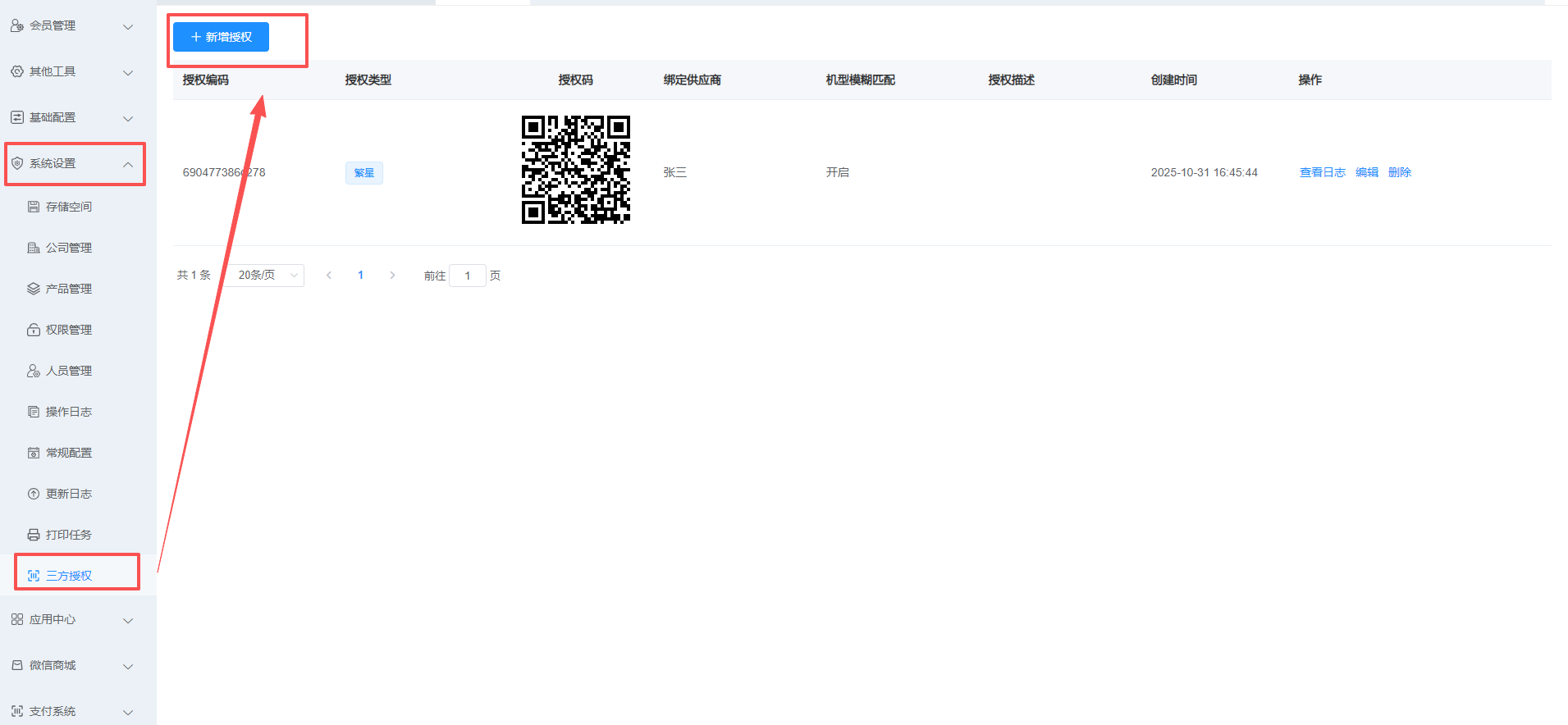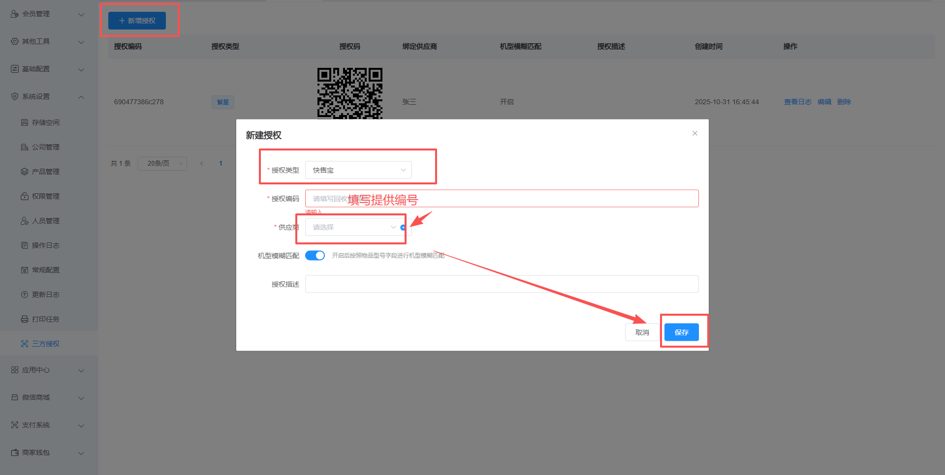2、打开爱管机系统设置-三方授权页面,新增快售宝授权,如下图所示: