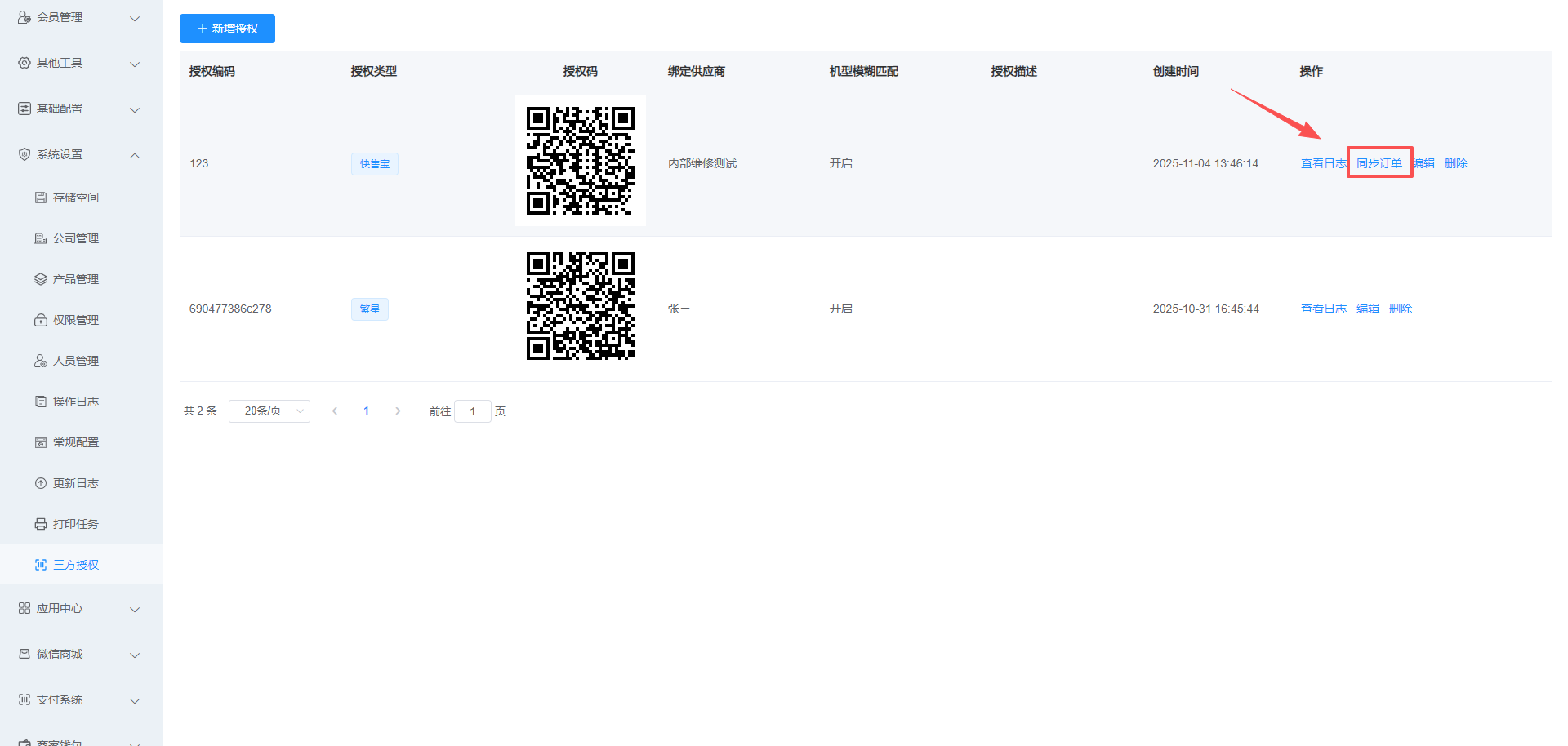 4、每天晚上自动同步之前数据(从上次同步完成到现在,这中间的范围),或手动在三方授权点击同步,如下图所示: