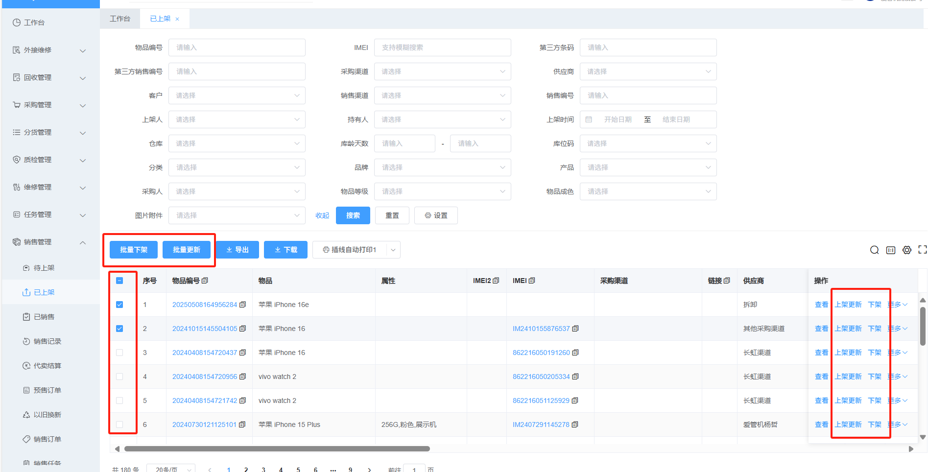 销售管理已上架-选择需要下架的物品-批量下架(批量更新销售平台(客户)名称