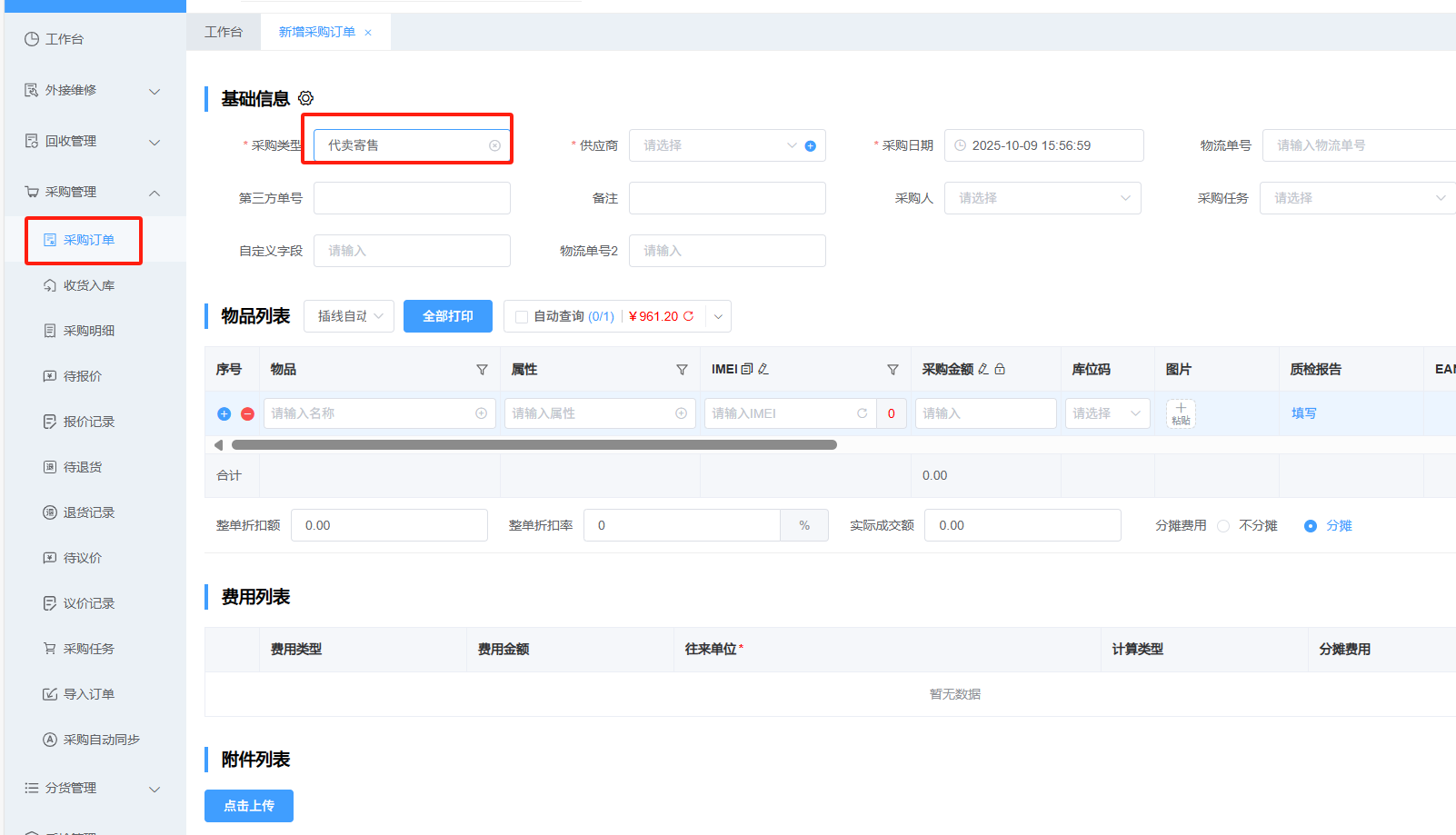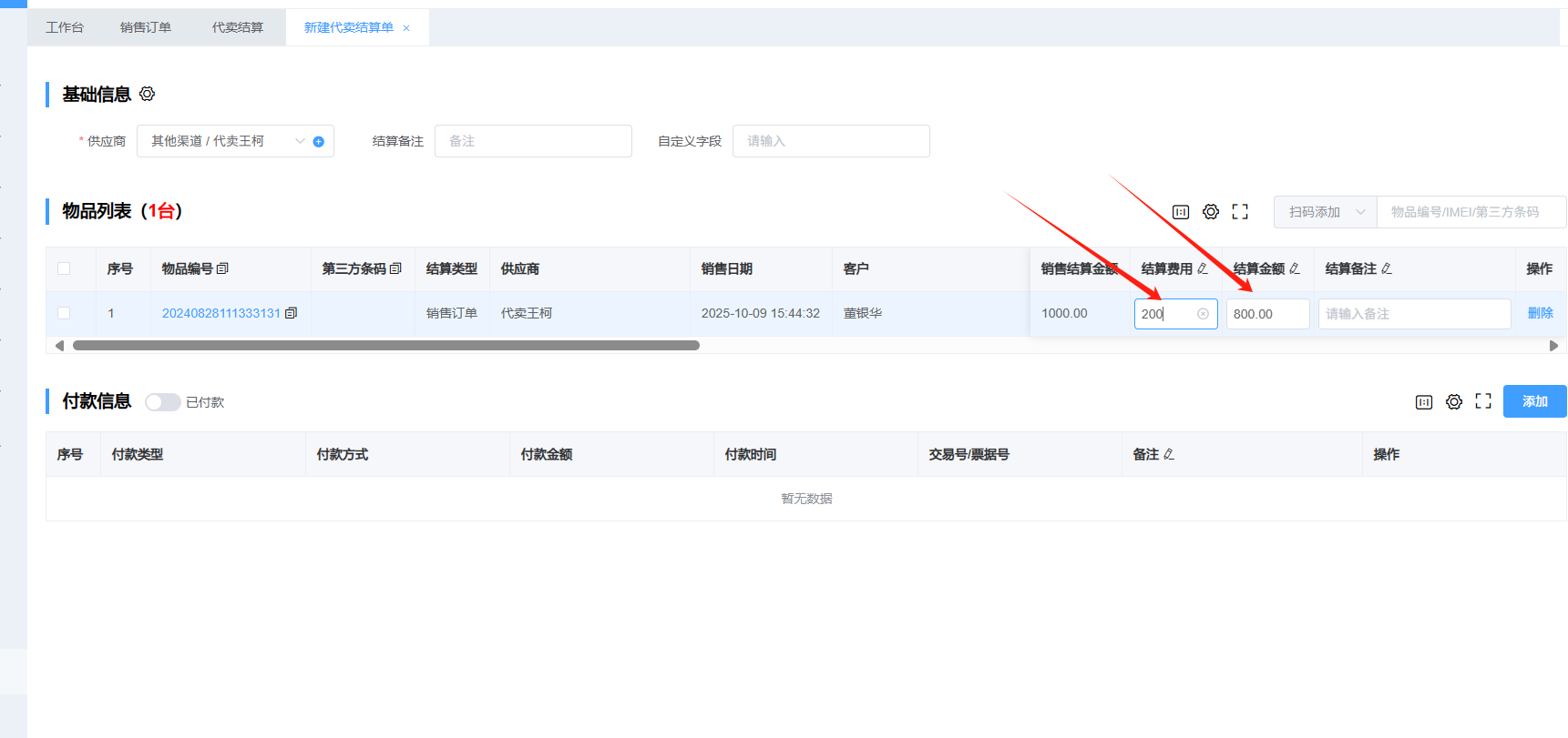 4:跳转至新建代卖结算单后,填入结算费用(代卖该物品收取的服务佣金),结算金额自动算出,结算金额即为给代卖物品供应商真实打款的金额,添加付款信息 ,提交保存单据即可