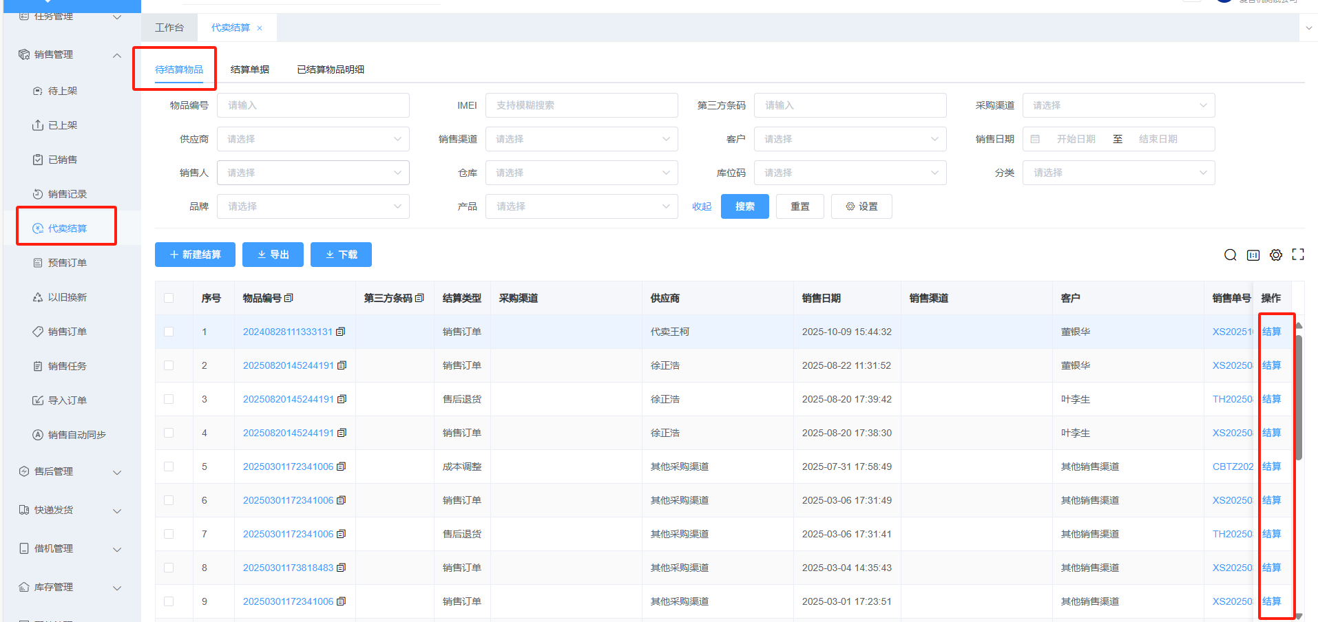 3:代卖结算库存的物品在普通销售之后会自动进入代卖待结算列表,可勾选需要结算的物品点击+批量结算,或在物品列表右侧操作栏点击结算按钮结算指定物品