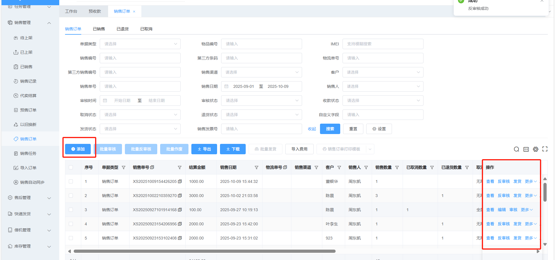 1.点击+添加可创建销售订单 操作栏可对已创建销售订单进行反审核、编辑修改销售单据信息
