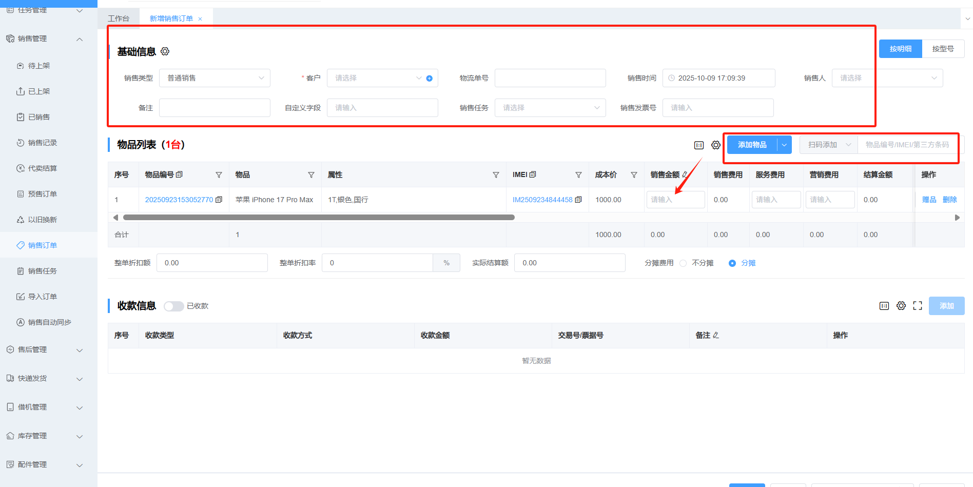 2.填写销售信息-添加物品/扫码添加