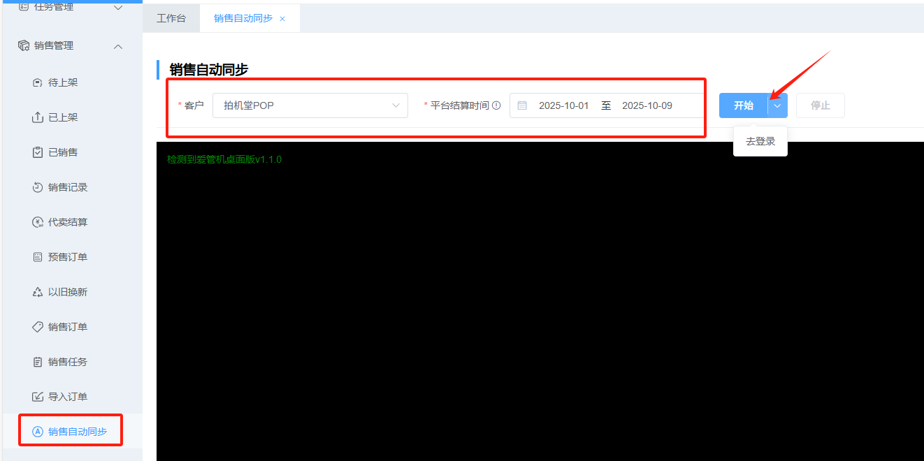 销售管理-销售自动同步 选择需要的同步的销售平台(客户)及平台结算时间-登录平台账号-点击开始即可自动同步所选平台已销售结算完成的机器信息,并自动创建销售订单