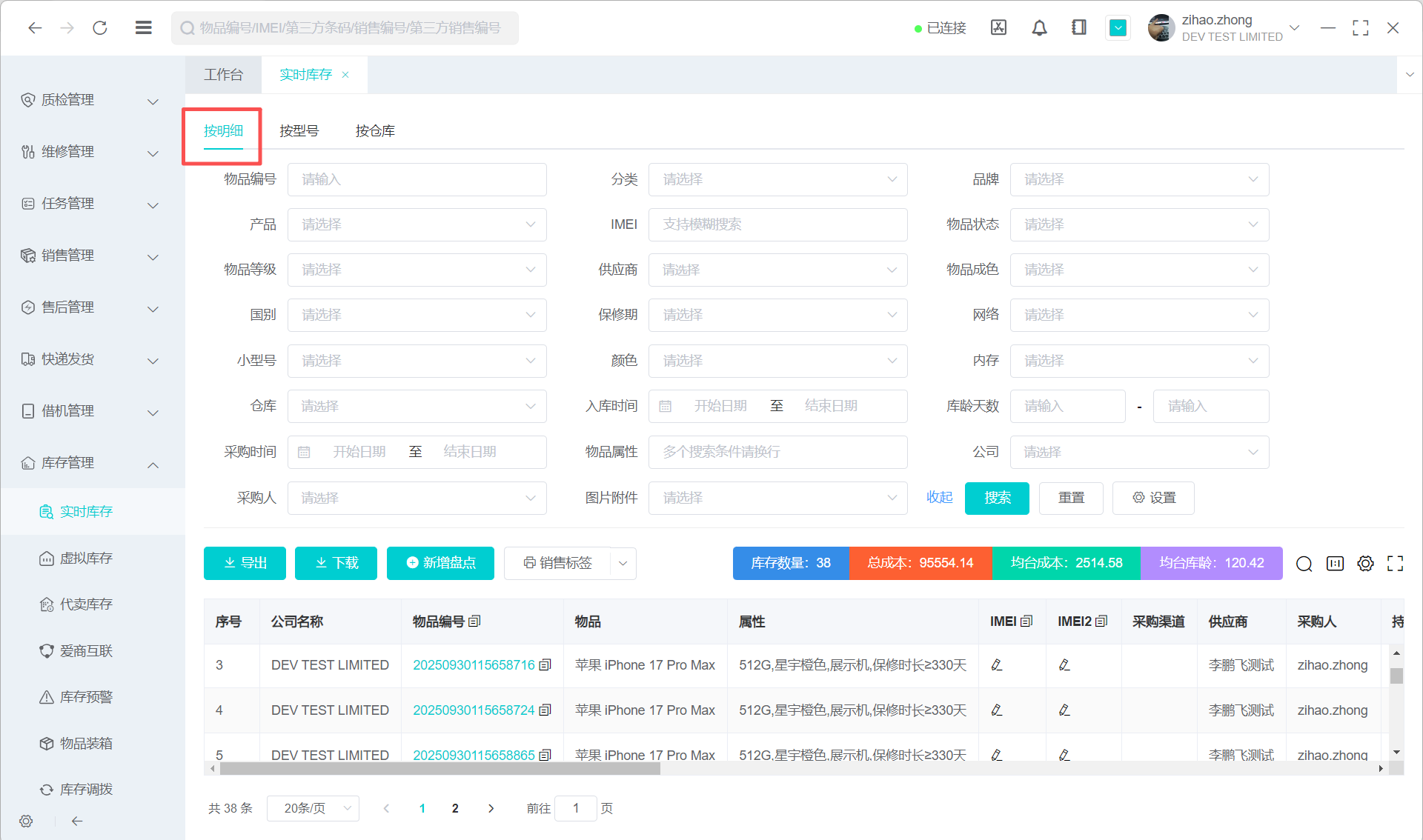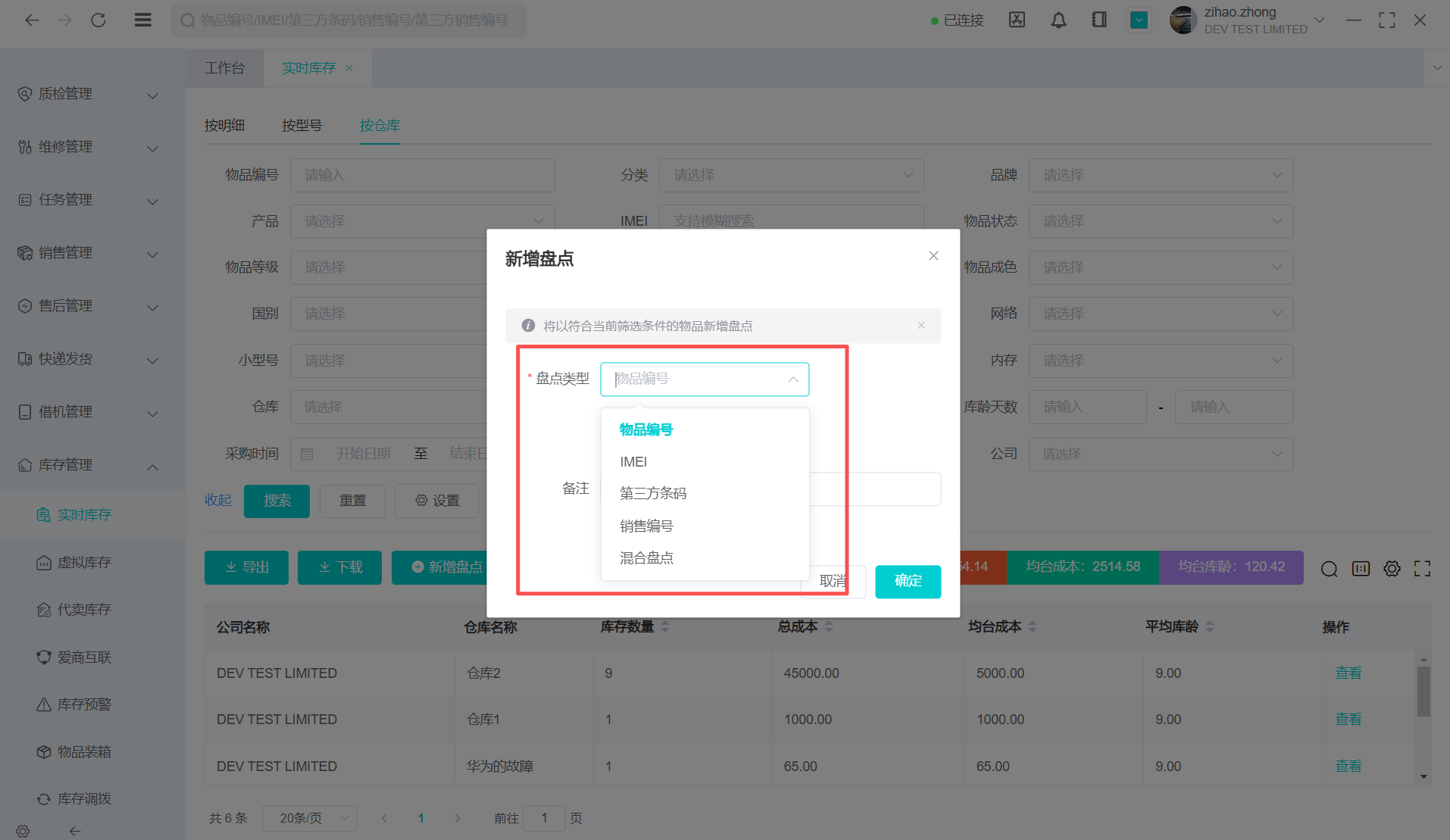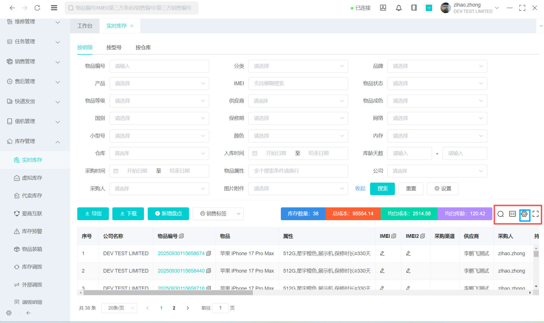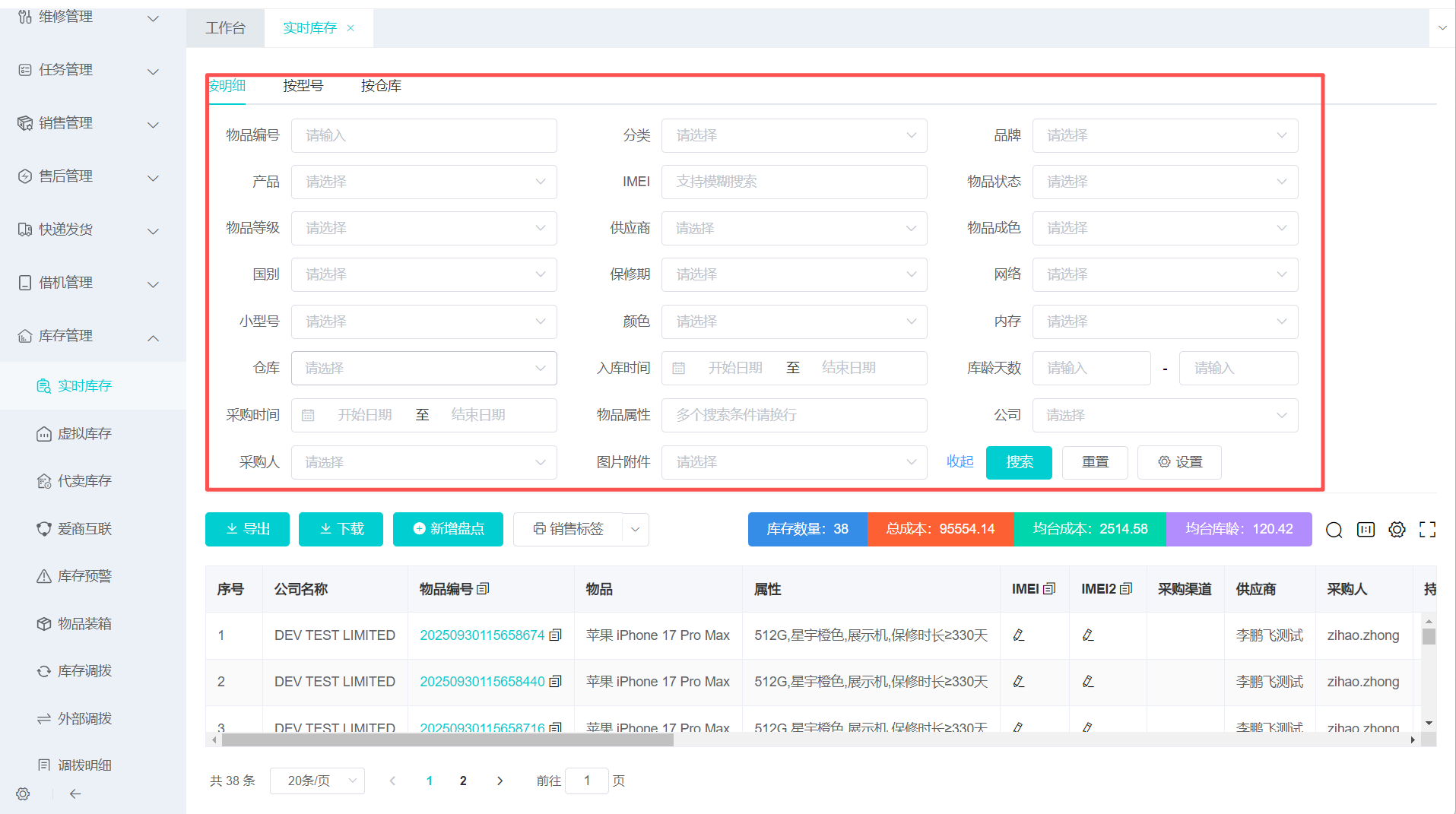 1.1. 输入物品编号,IMEI,分类-品牌-产品,物品状态,物品等级,供应商,物品成色等其他查询项