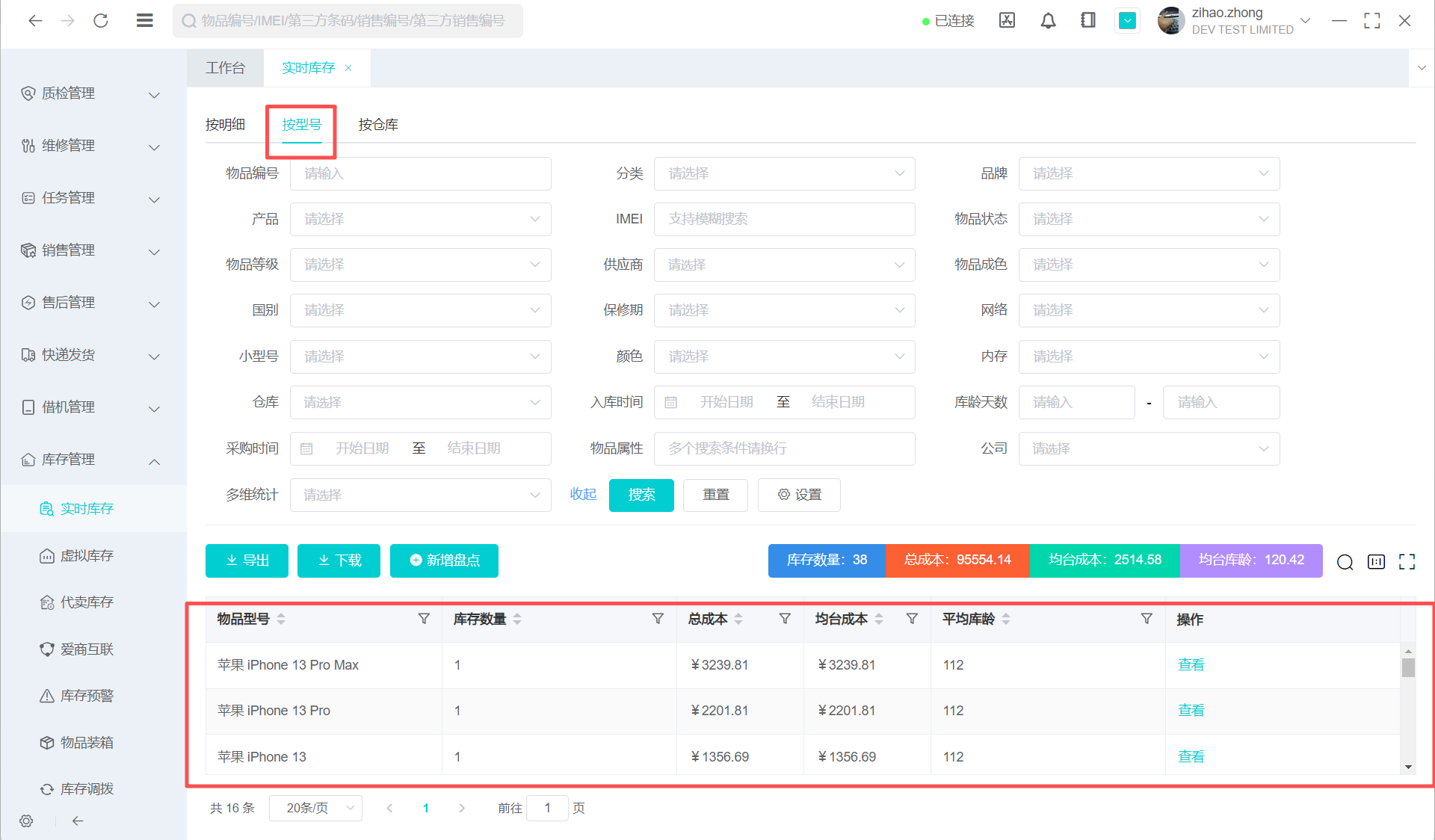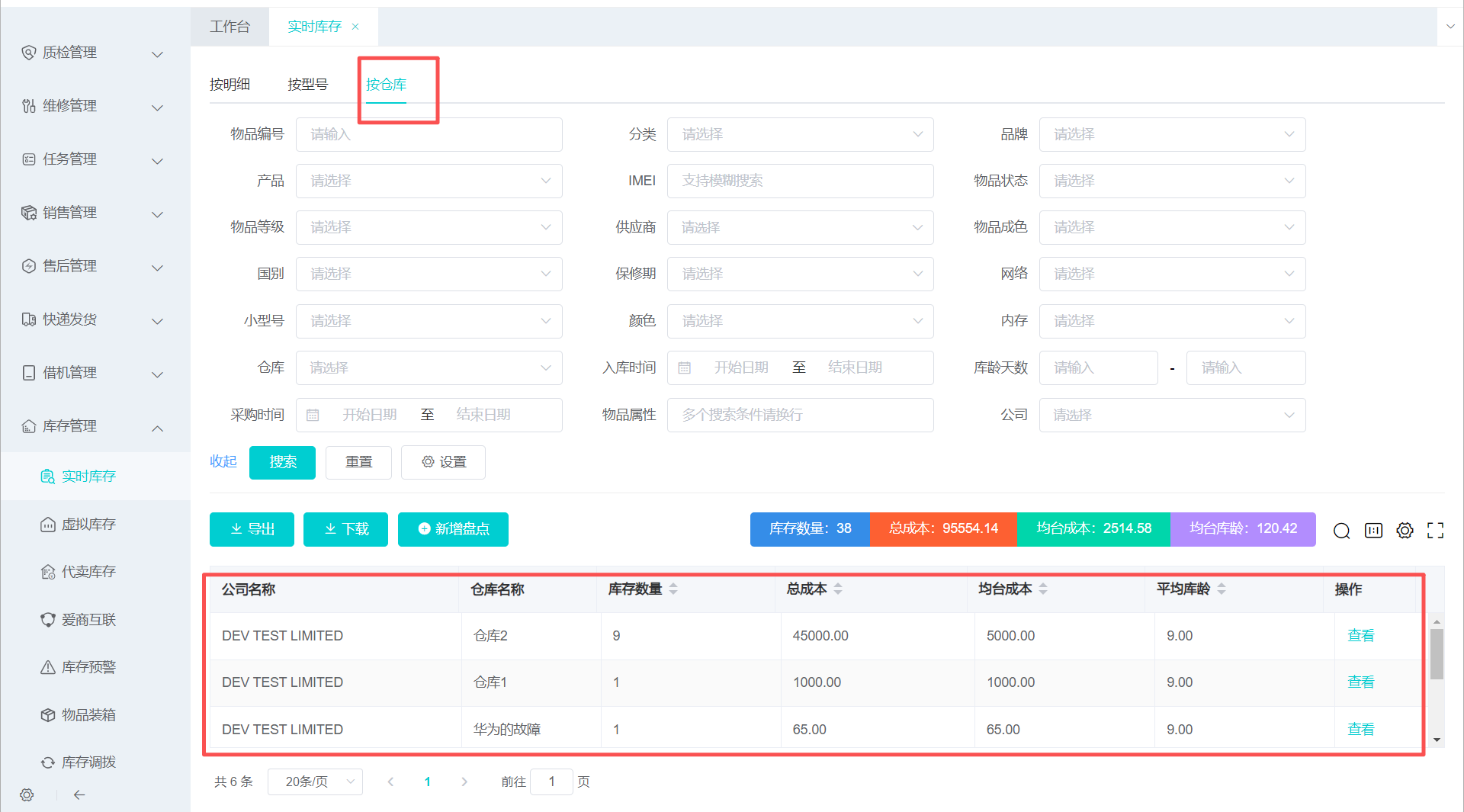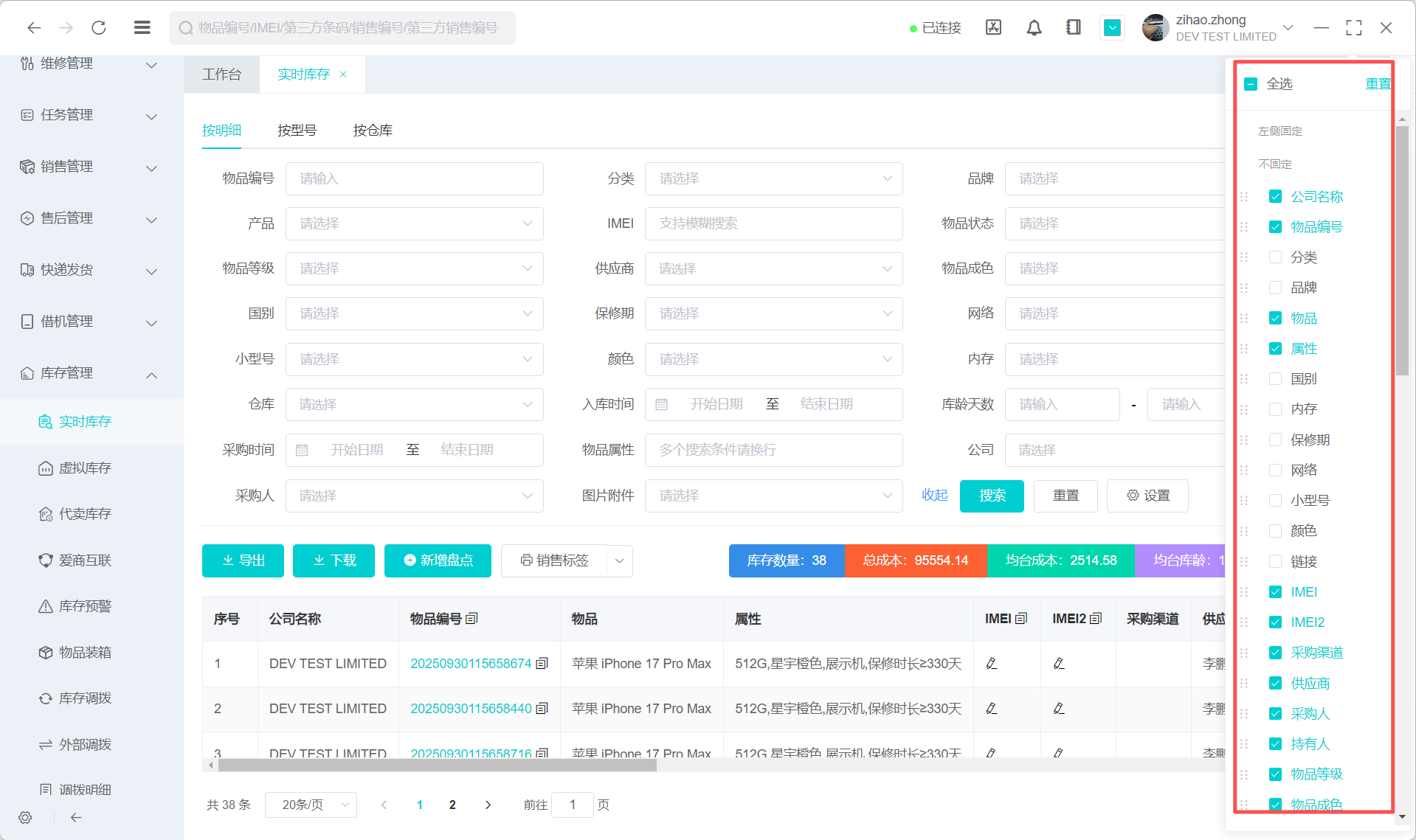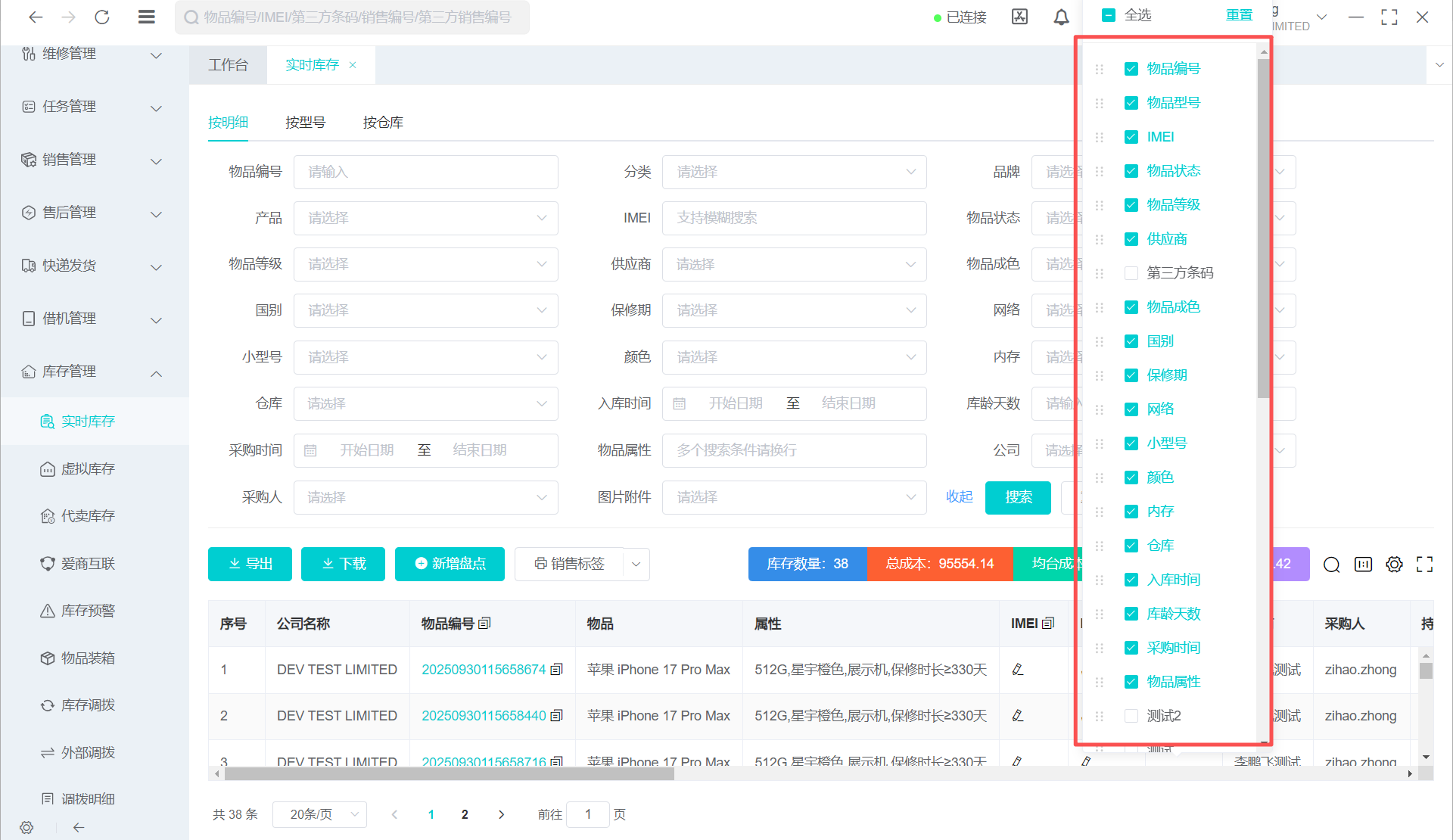 1.1. 输入物品编号,IMEI,分类-品牌-产品,物品状态,物品等级,供应商,物品成色等其他查询项