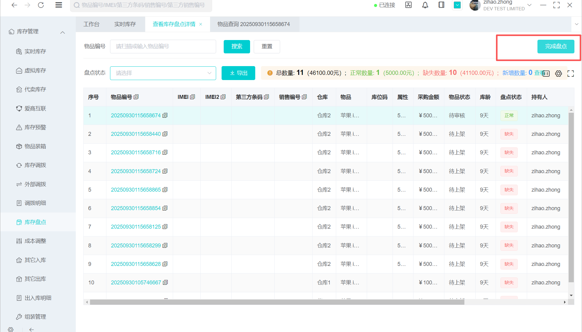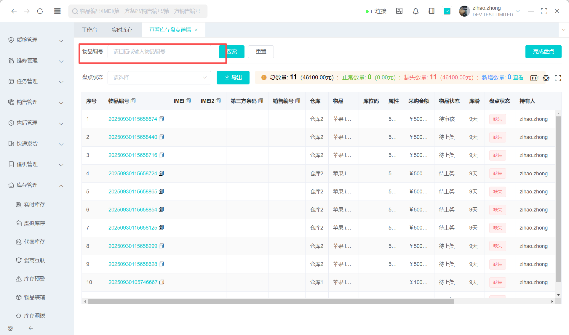 2.6.2.可以扫物品编号进行盘点,物品存在显示正常,物品不在显示缺失
