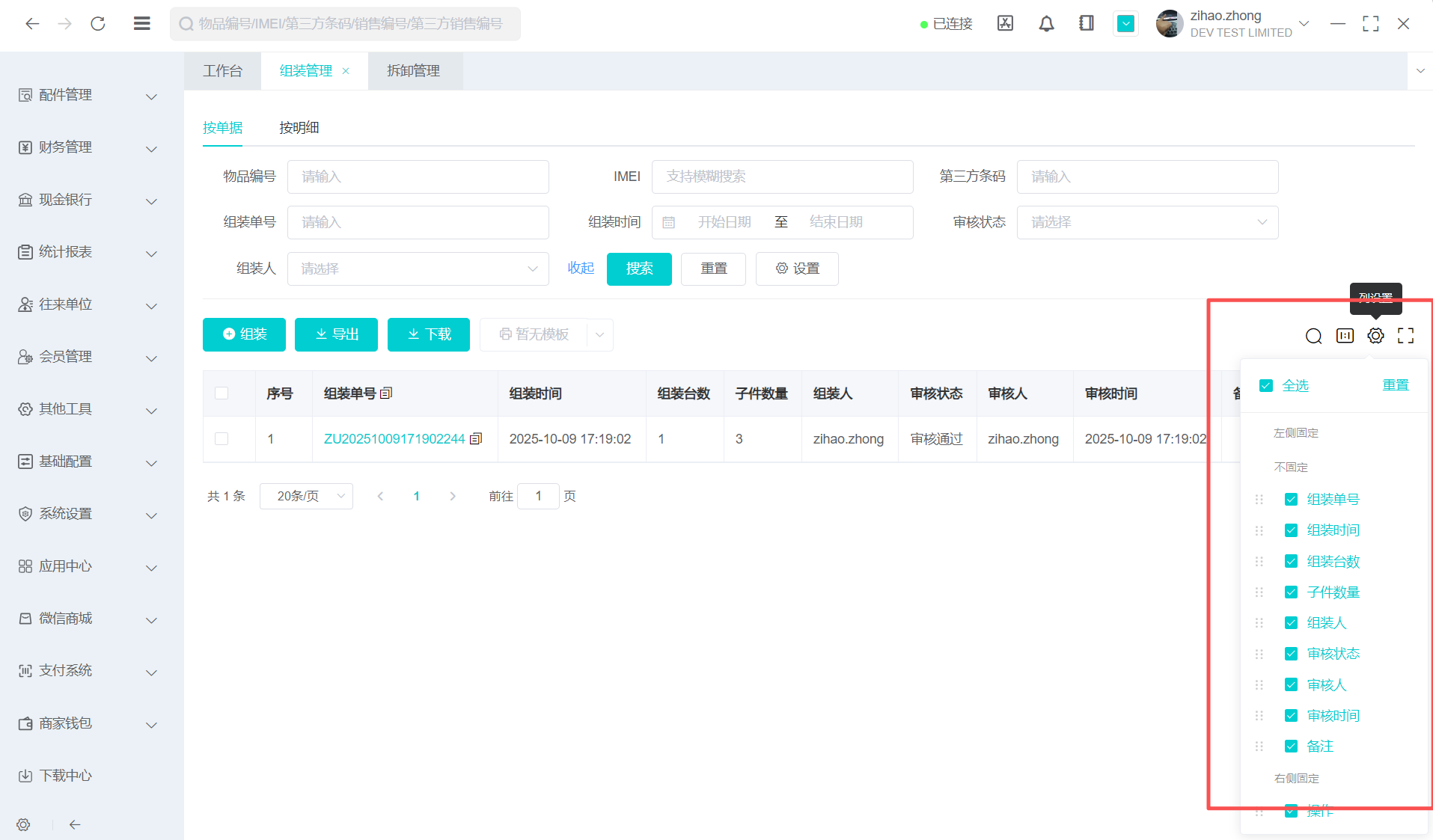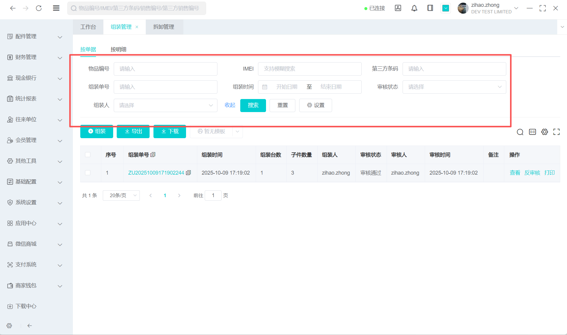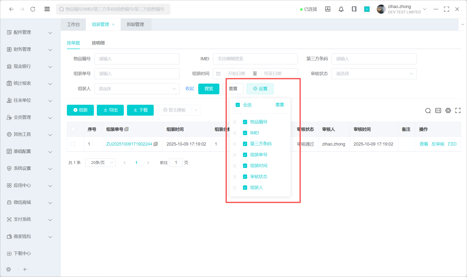 1.1. 选择物品编号,IMEI,第三方条码,组装单号,组装时间,审核状态,组装人等其他查询项