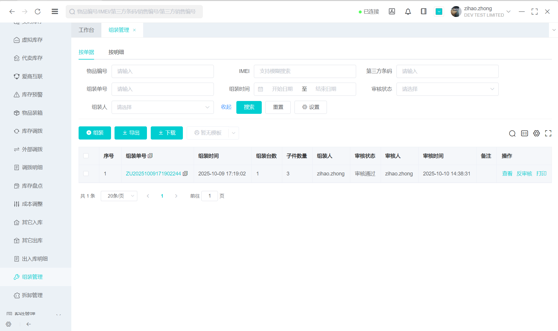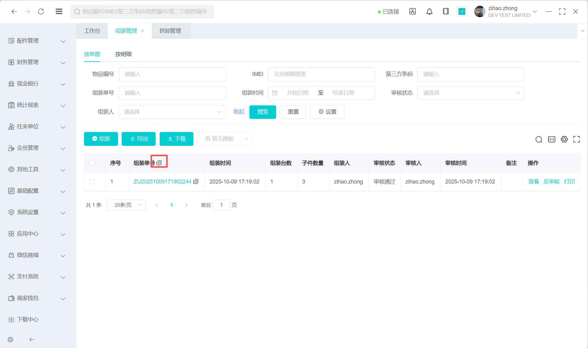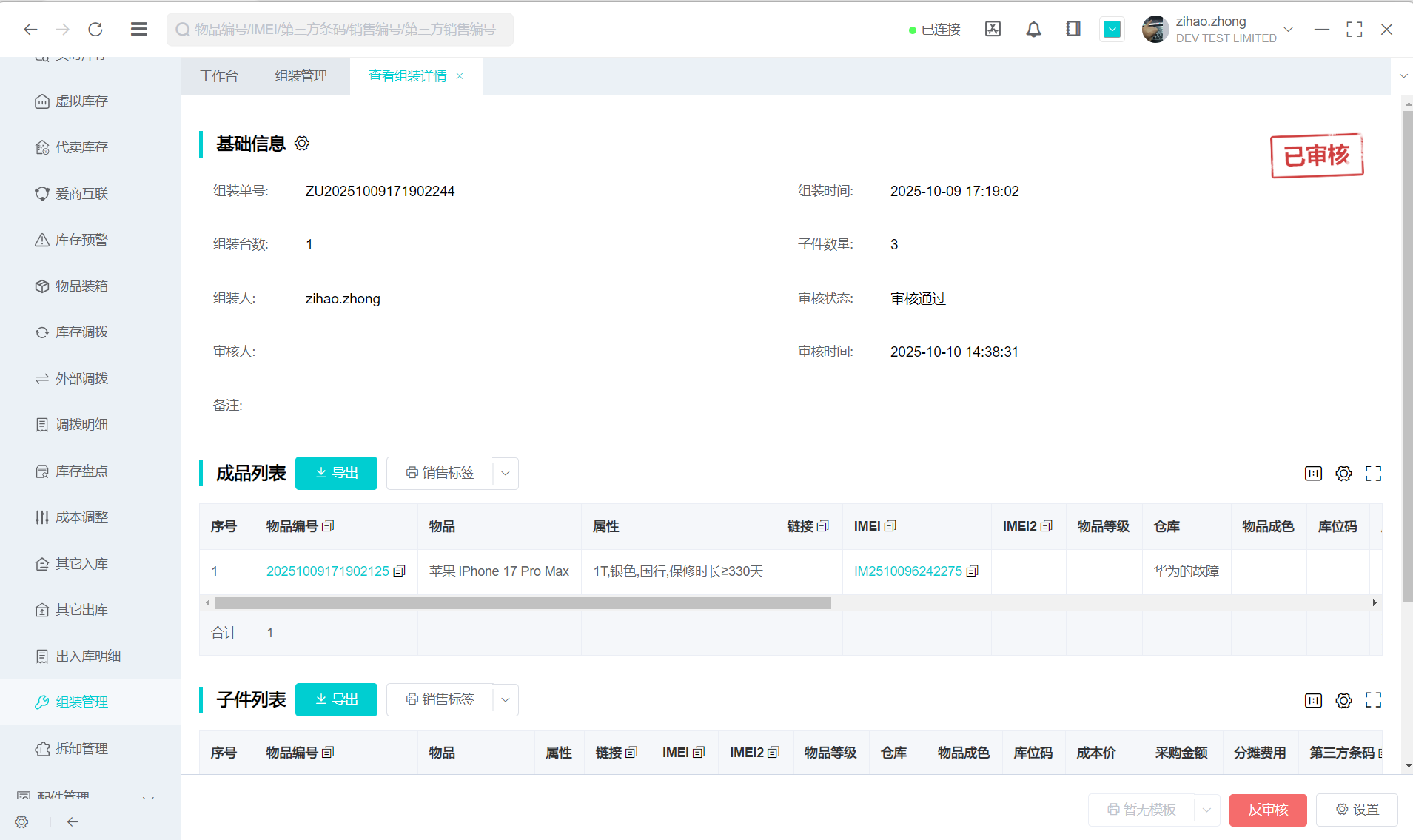 2.反审核通过后,可进行查看、编辑、审核、打印单据等,点击编辑将跳转到编辑组装订单,修改订单基础信息、物品列表后,再次提交审核