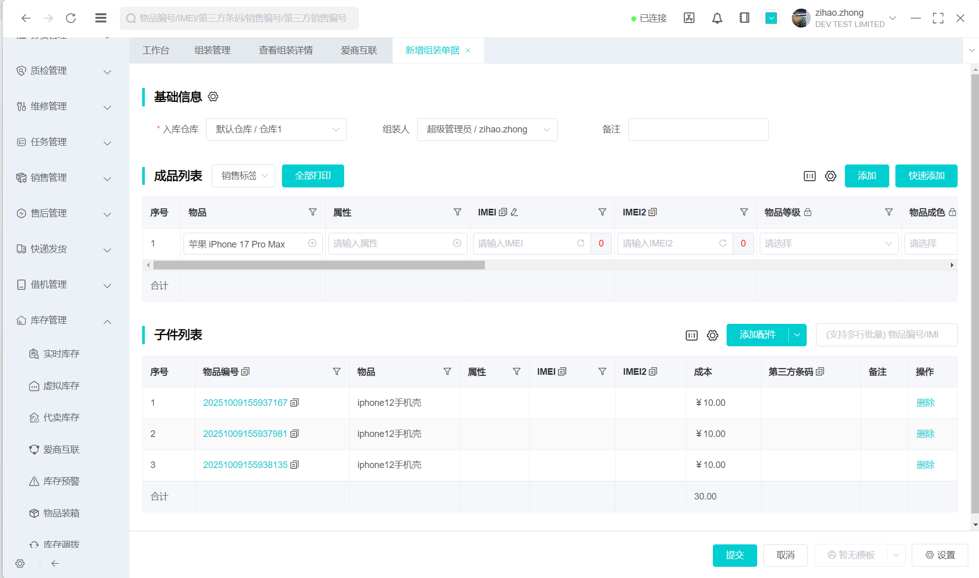 4.2. 填写入库仓库,组装人,选择成品和子件,成本的成本是子件的成本之和