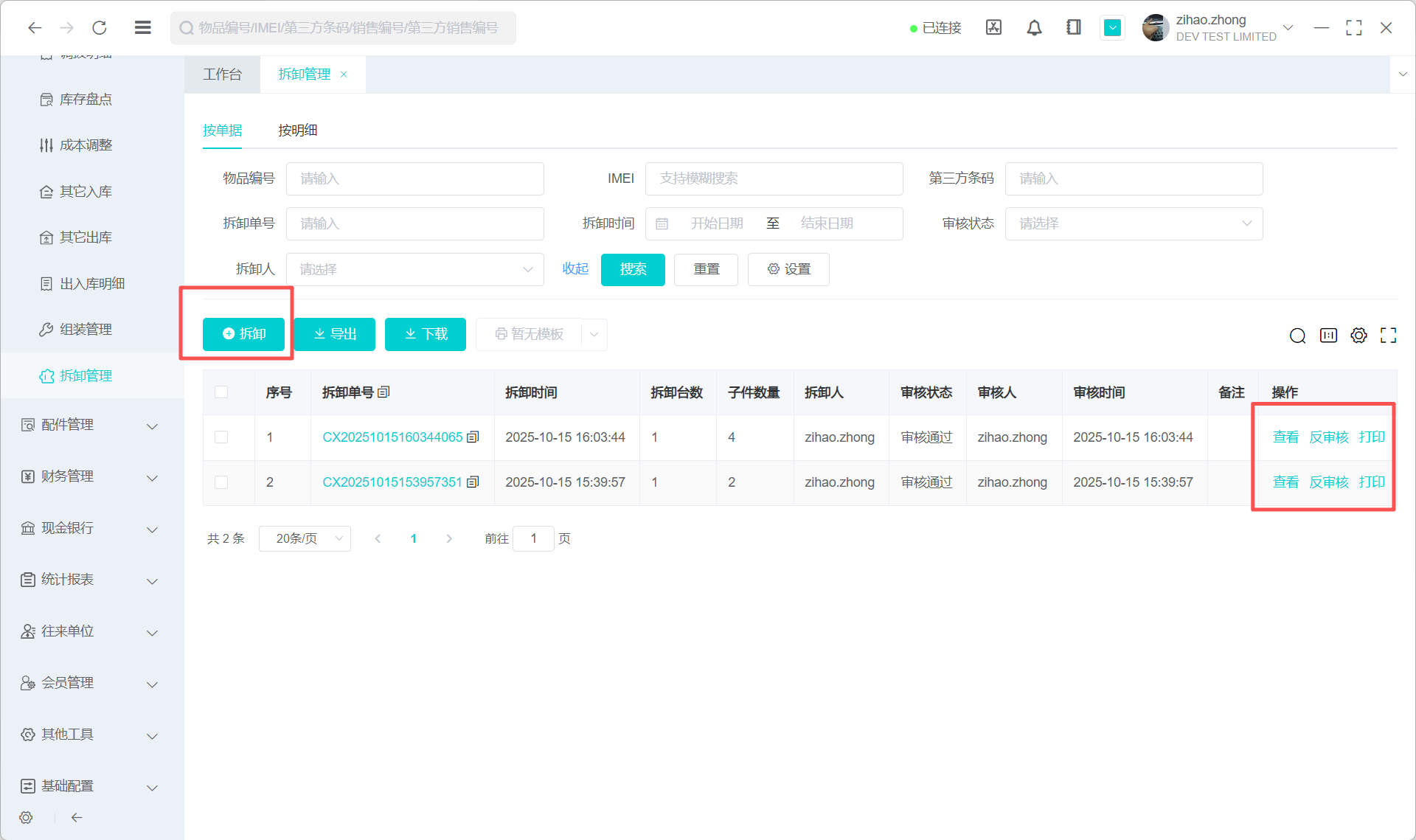 1.点击+拆卸可创建拆卸订单 操作栏可对已创建拆卸订单进行反审核、编辑修改拆卸单据信息