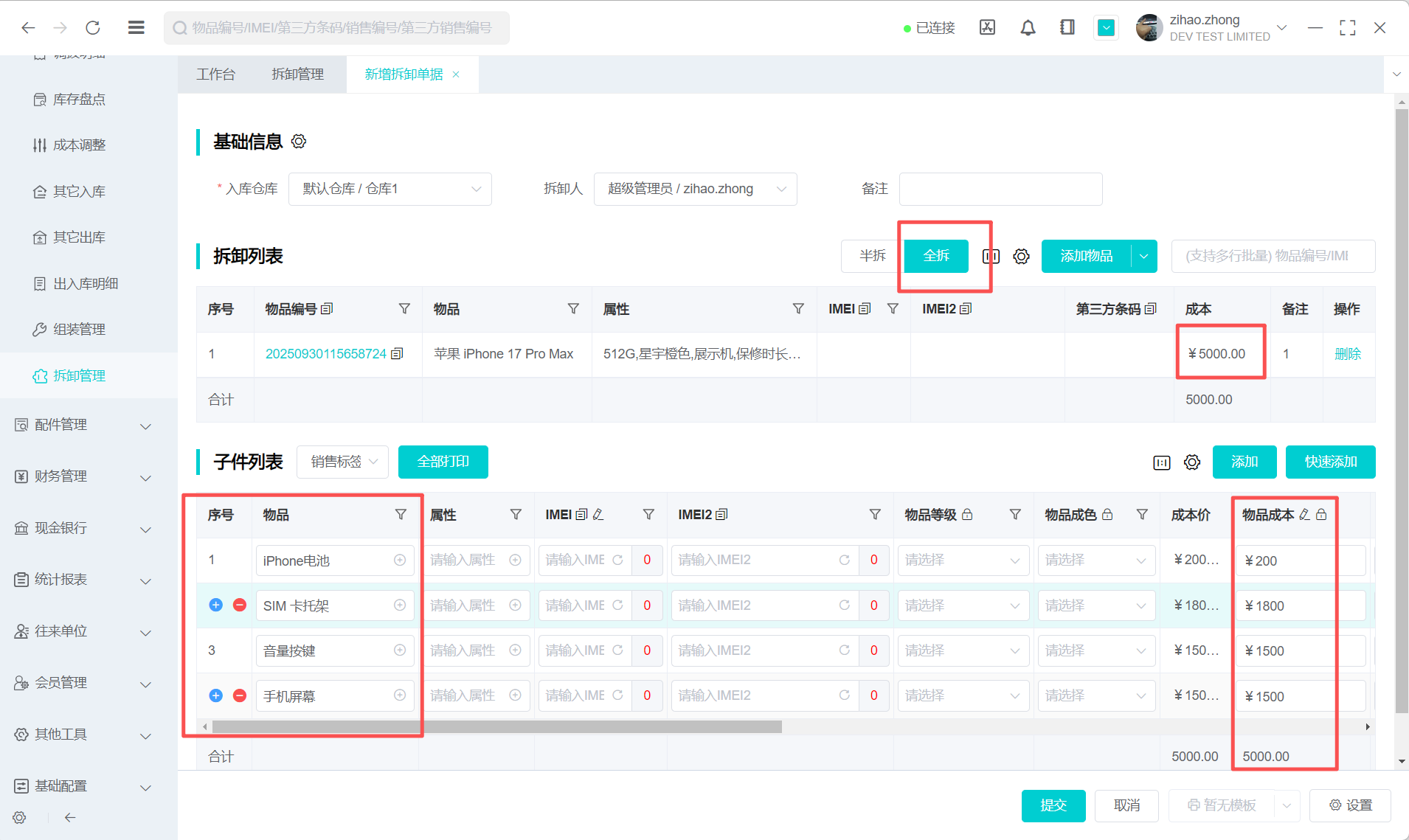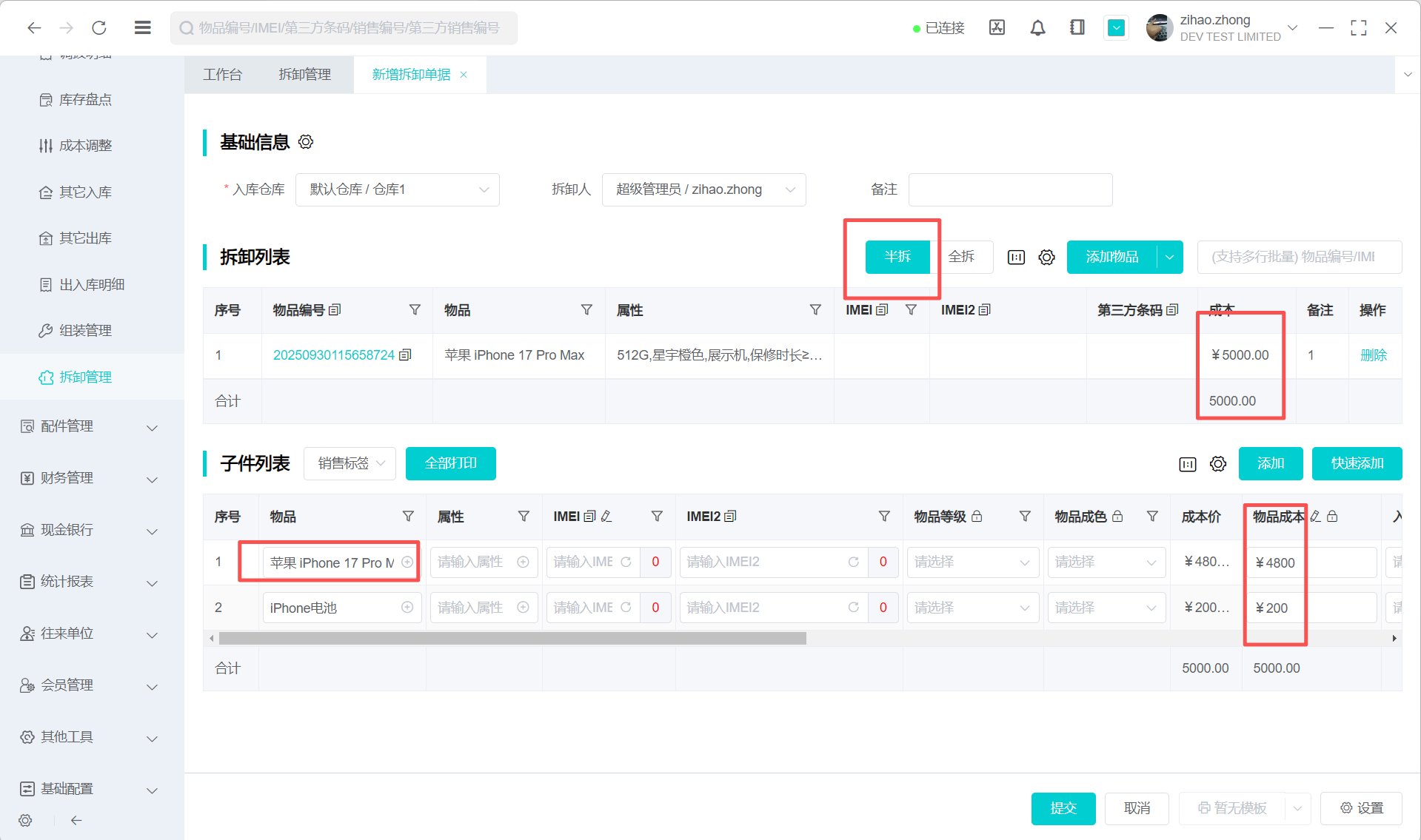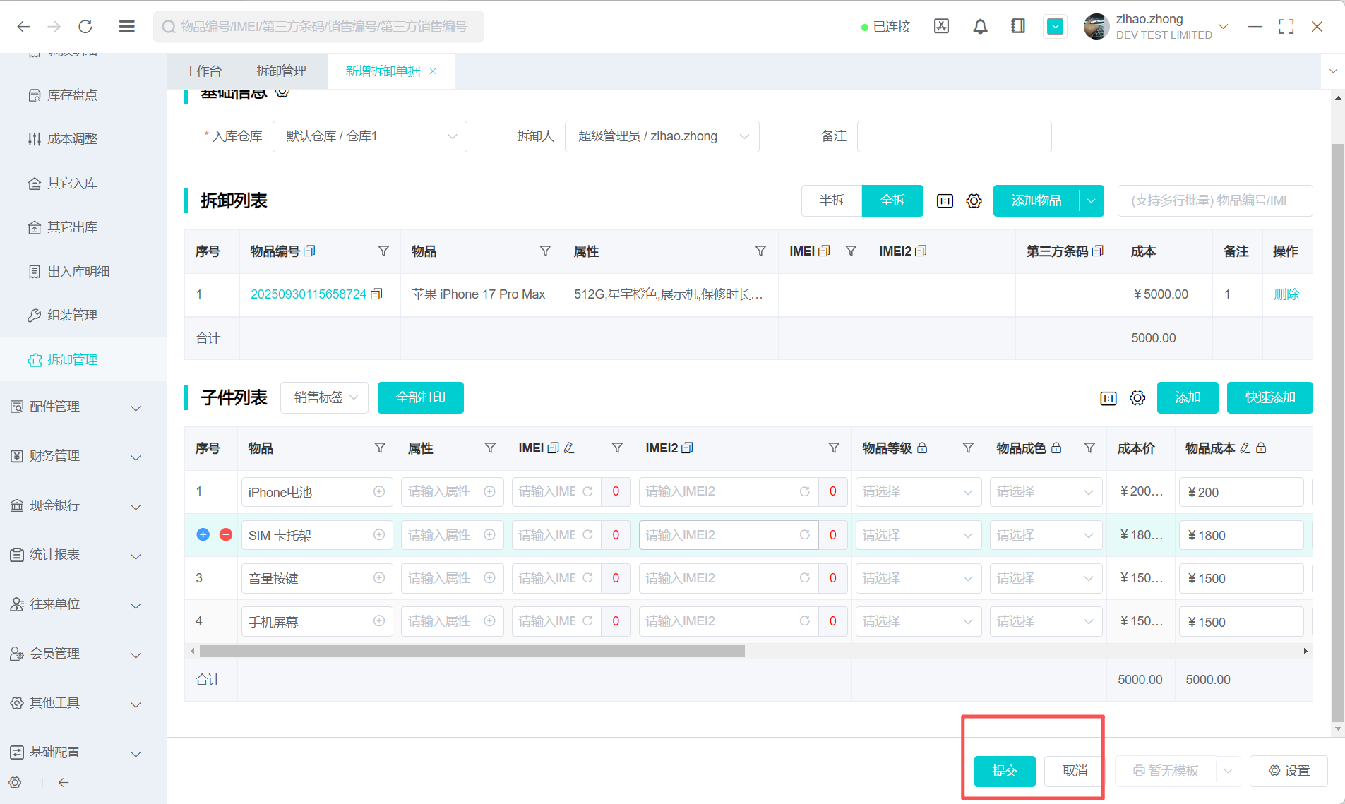 2.新增拆卸单据