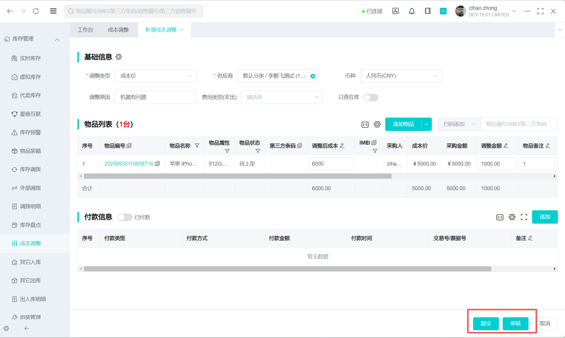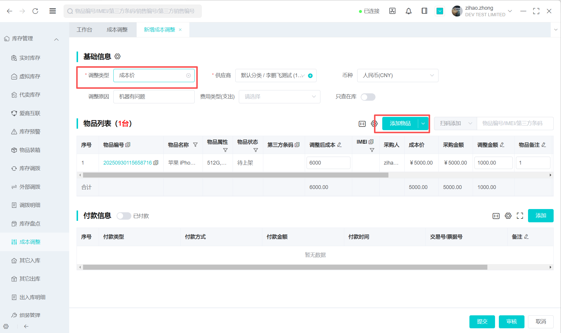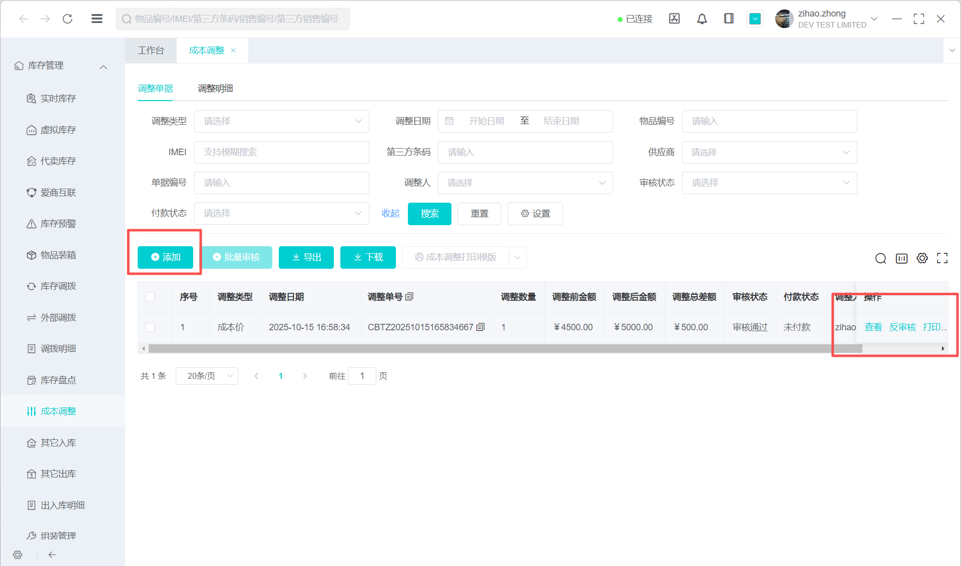 1.点击+添加可创建成本调整订单 操作栏可对已创建的成本调整订单进行反审核、编辑修改成本调整单据信息