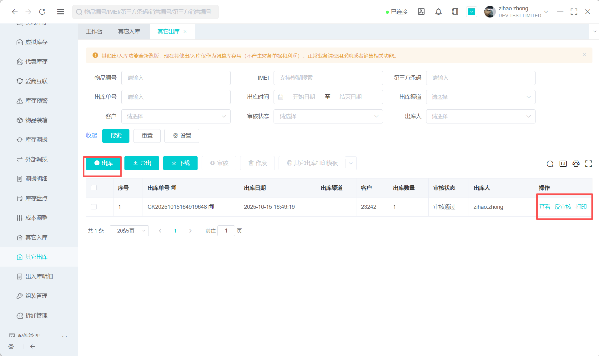 1.点击+出库可创建其他出库订单 操作栏可对已创建的其他出库订单进行反审核、编辑修改其他出库单据信息