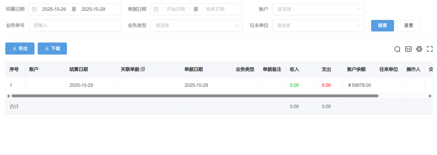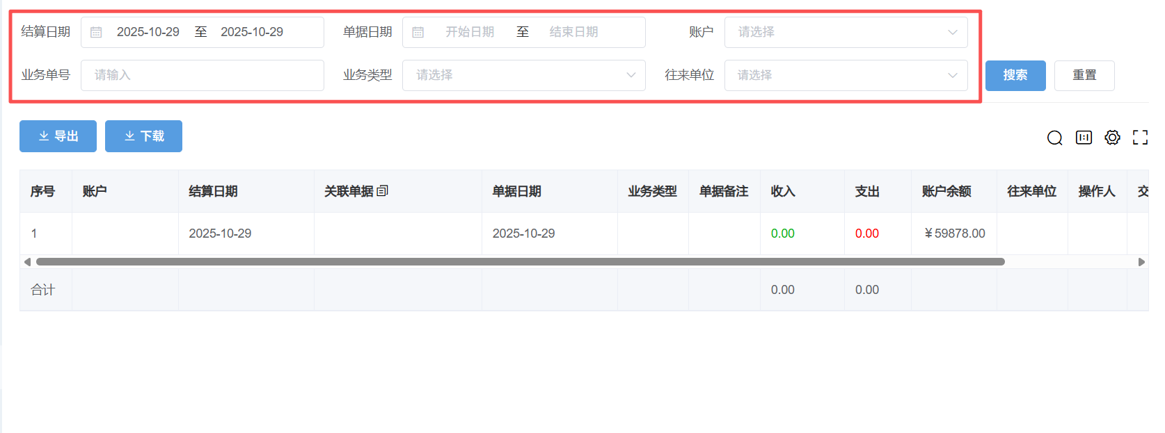 可根据选择对应结算日期或单据日期 账户等条件筛选流水