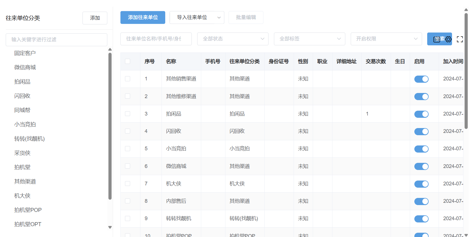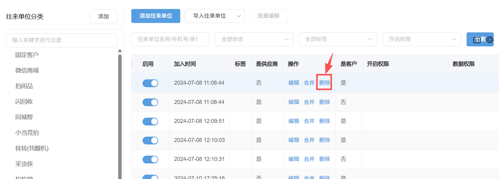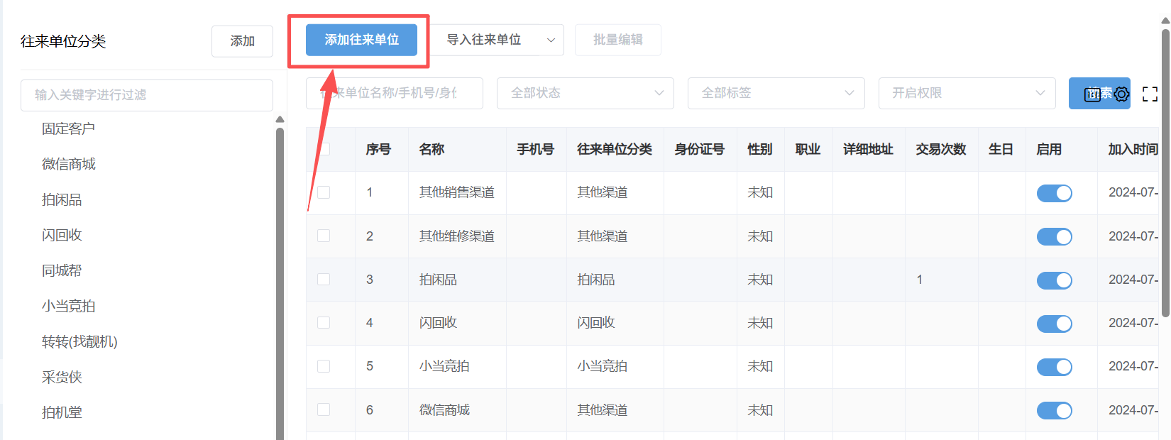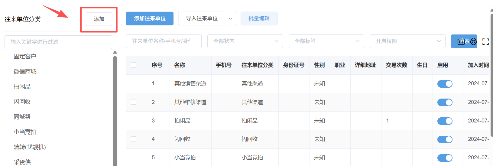 1:点击左侧添加,可添加往来单位分类名称