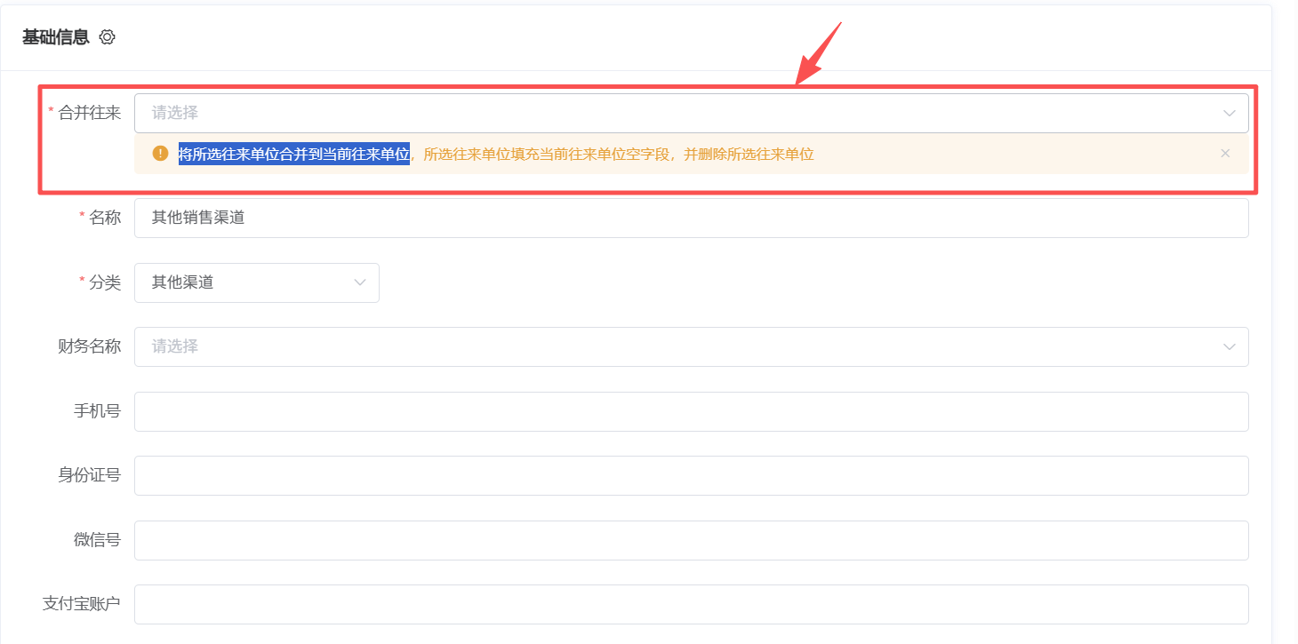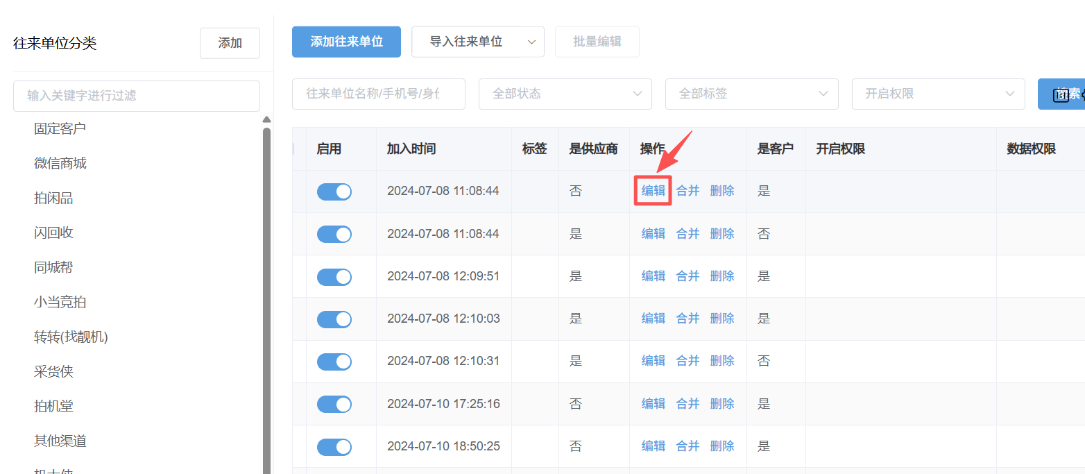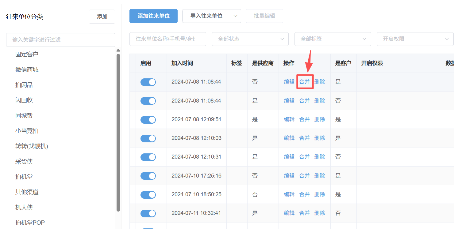 2.4:需把某个单位名称合并至其它分类下 点击操作下的合并