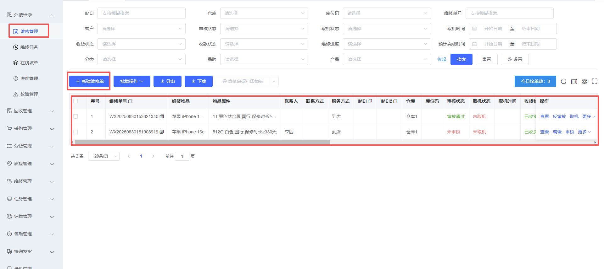 2、点击新建维修单,新增一个维修单据,如下图所示: