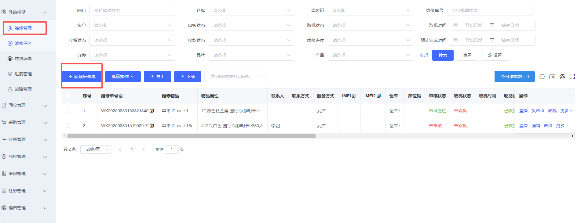 1、维修管理页面主要是新增维修单据和维修中、已维修物品进行管理查询,如下图所示: