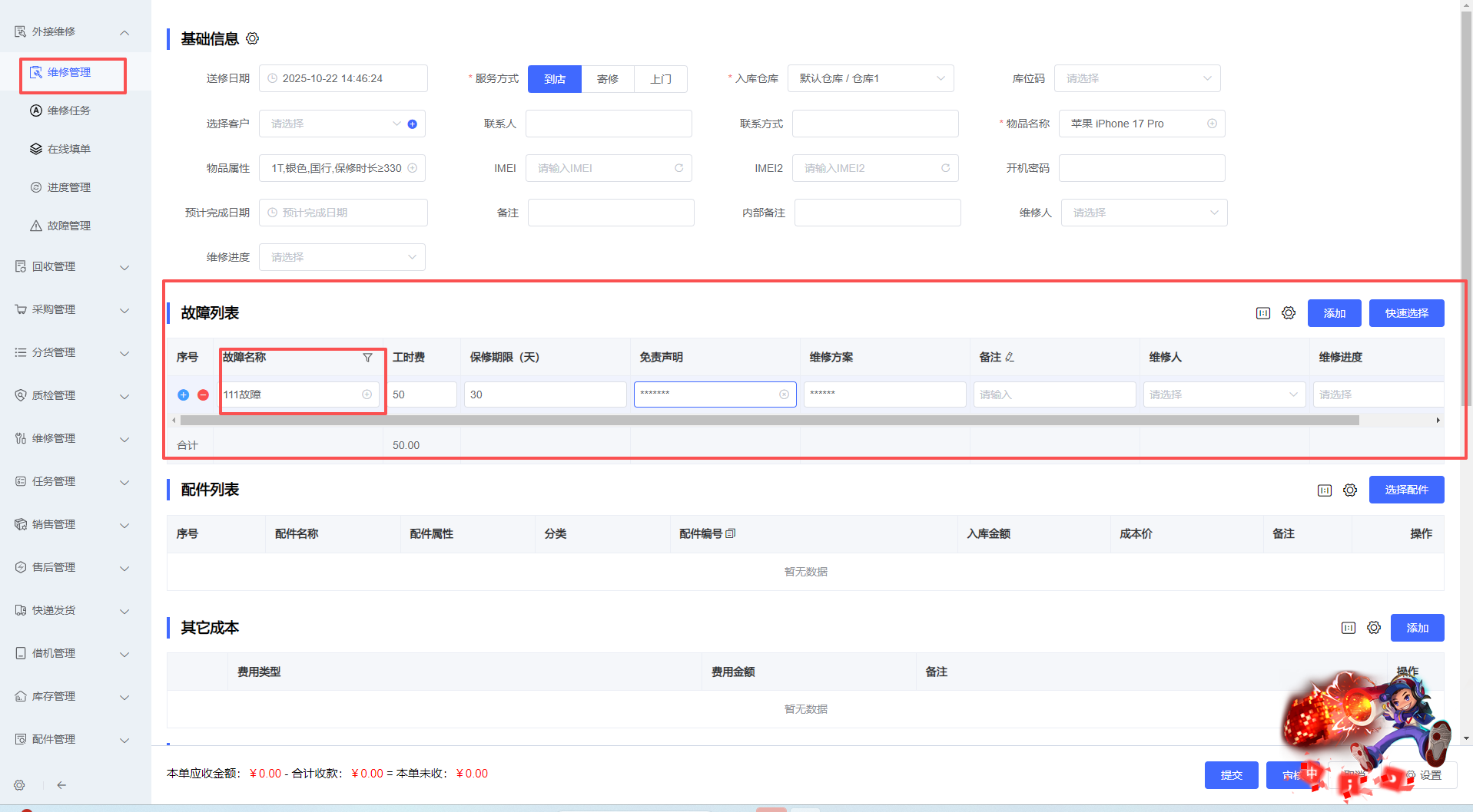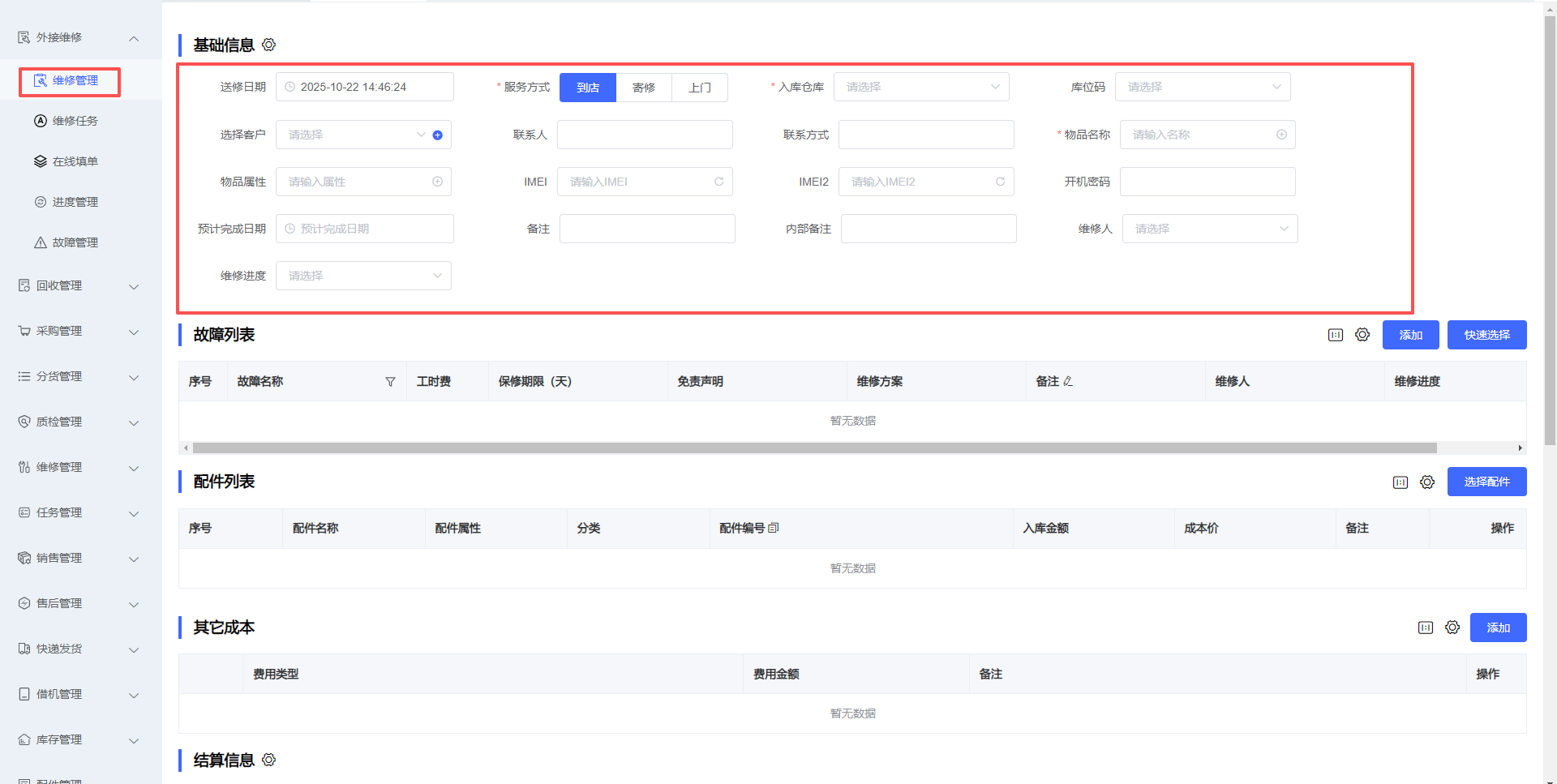 3、首先维护基础信息,如送修时间、服务方式、入库仓库、客户、物品名称、属性、IMEI、 开机密码、预计完成时间、维修人等信息,根据实际情况选填即可,如下图所示: