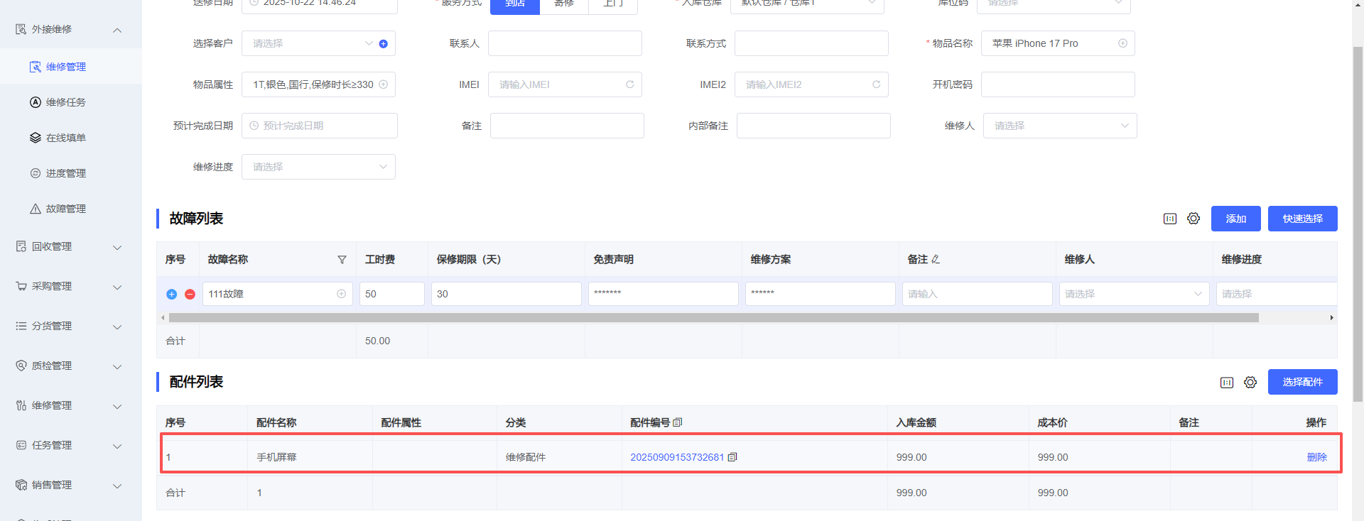 5、选择配件,根据实际选填,需要更换配件就维护,反之不做操作,如下图所示: