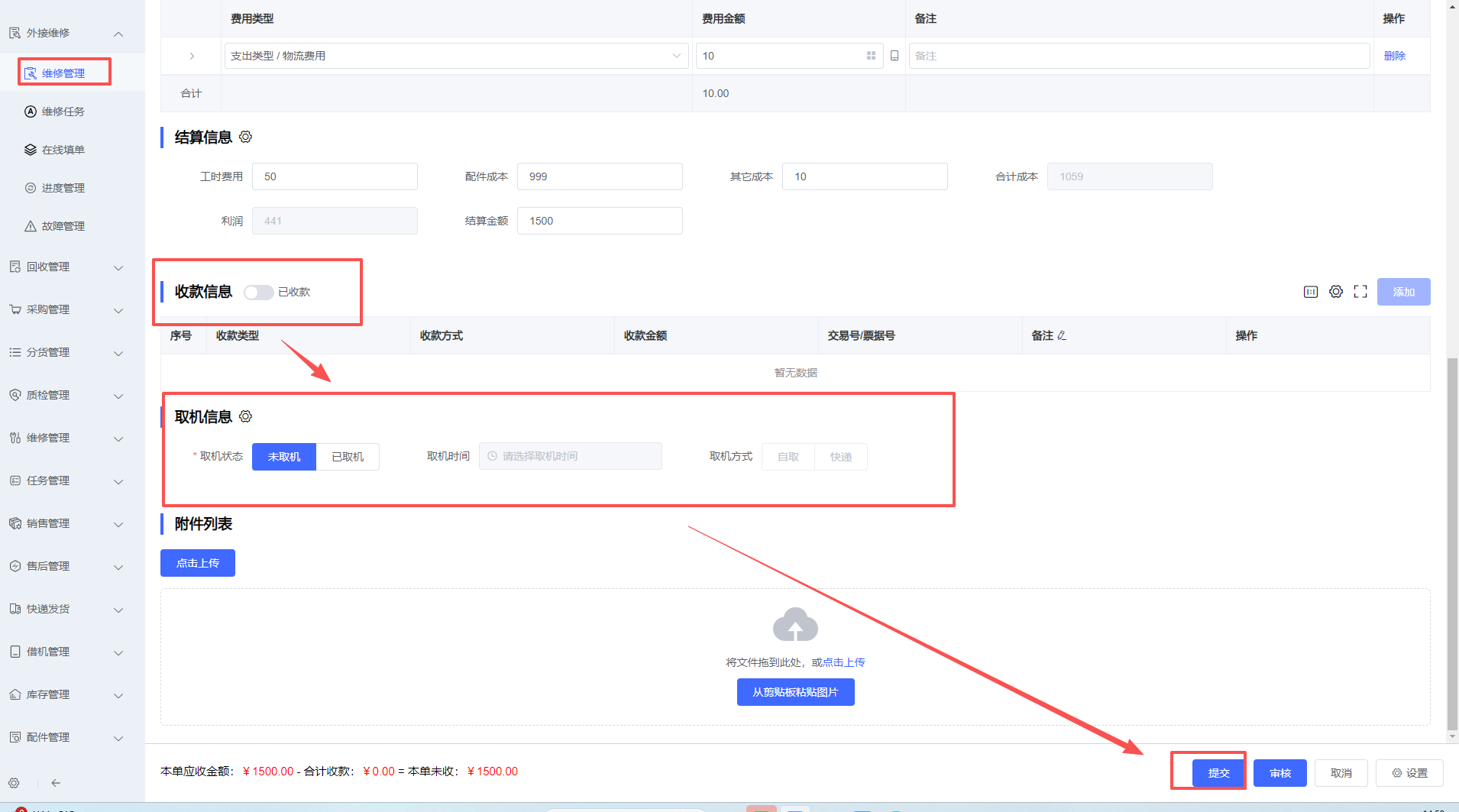 7、选填是否收款,以及取机信息,根据实际情况维护即可,维护完成点击提交即可完成维修单创建,如下图所示: