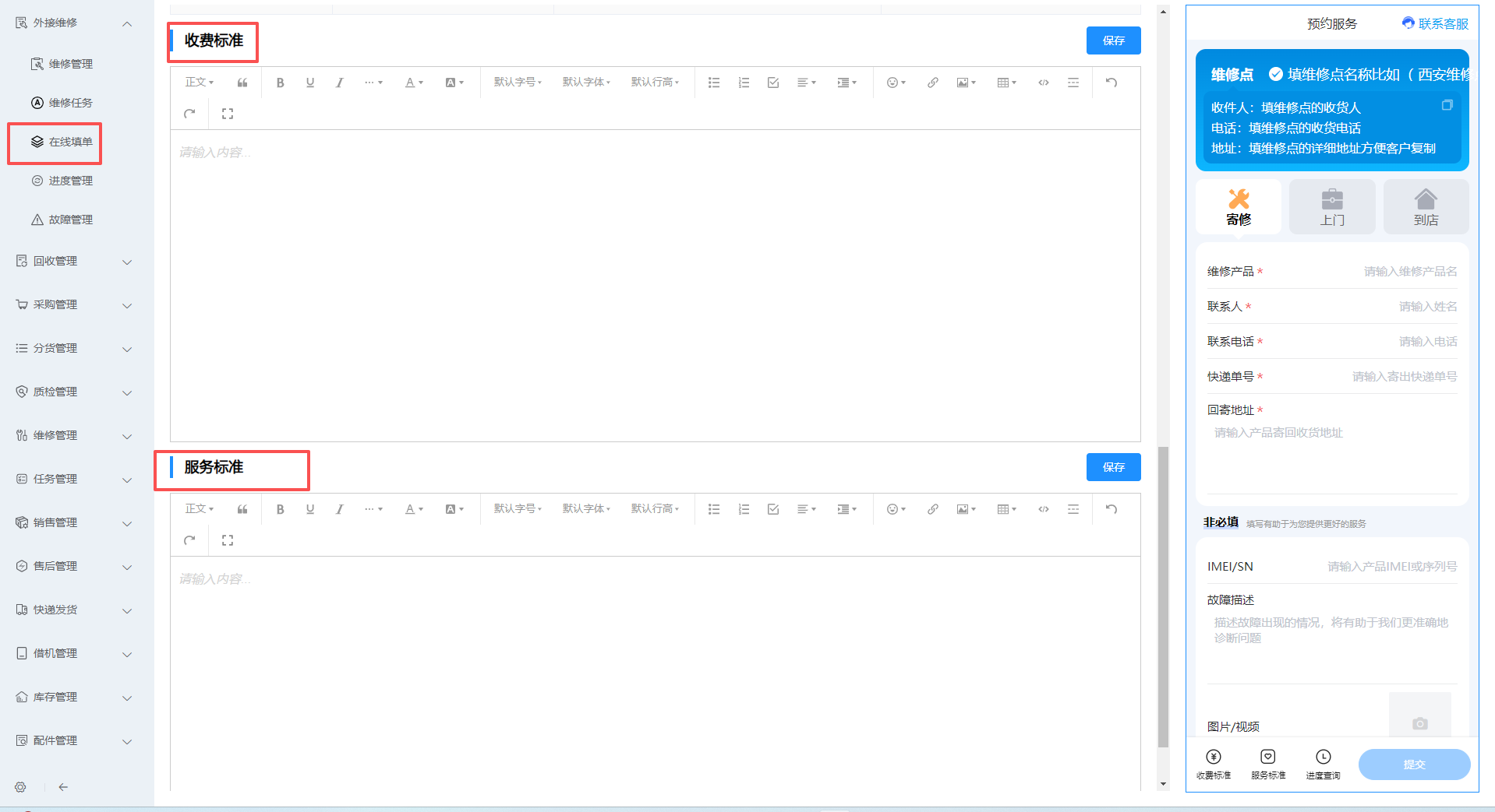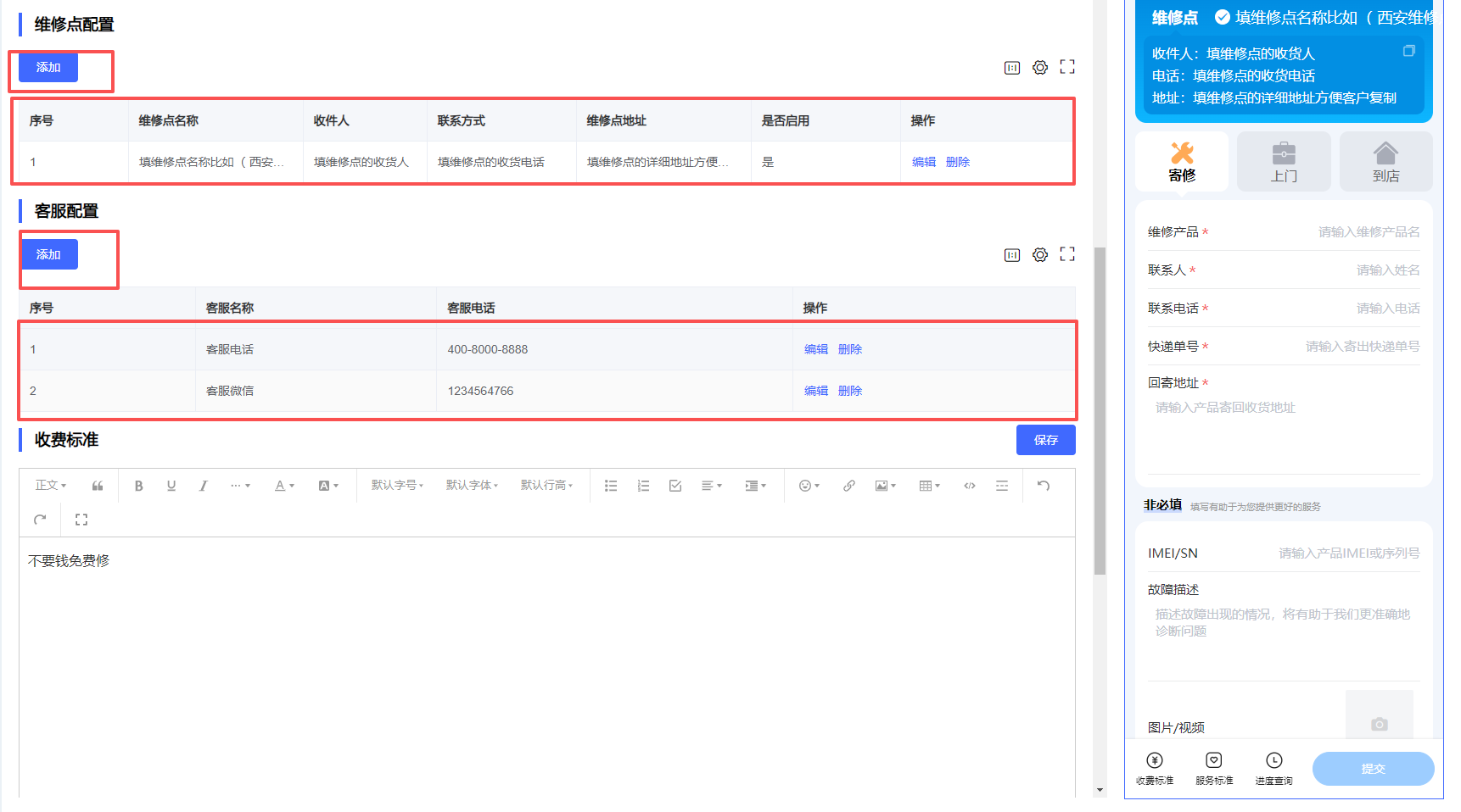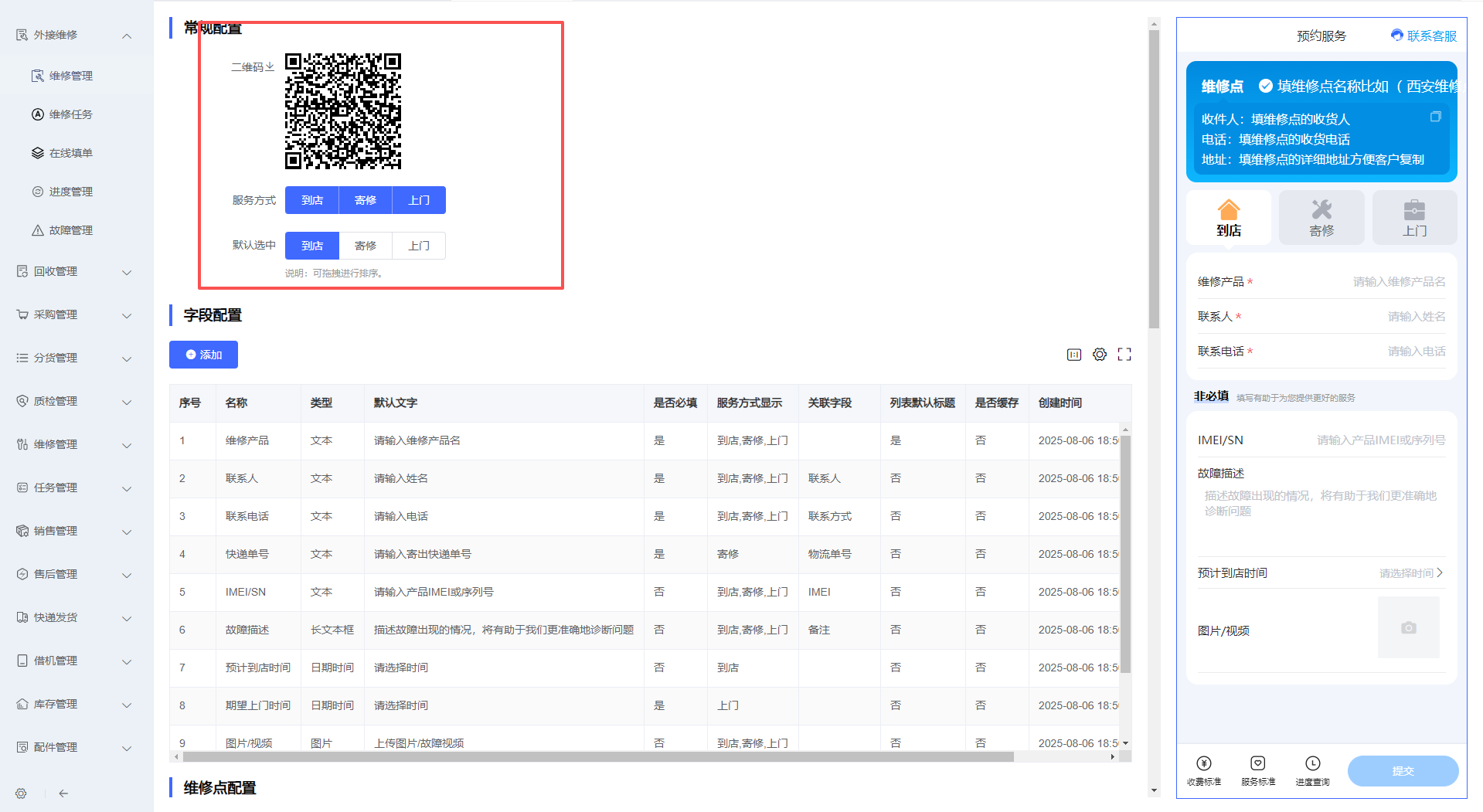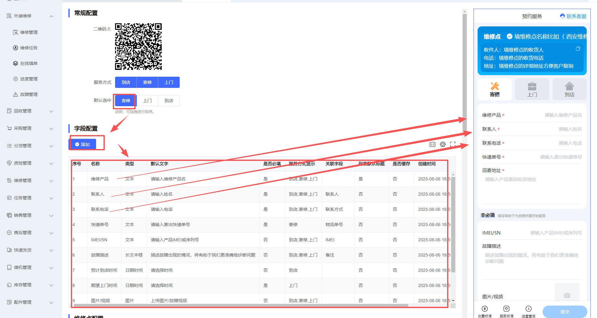 4、寄修、上门、到店都可根据实际情况添加所需信息或删除不需要信息
