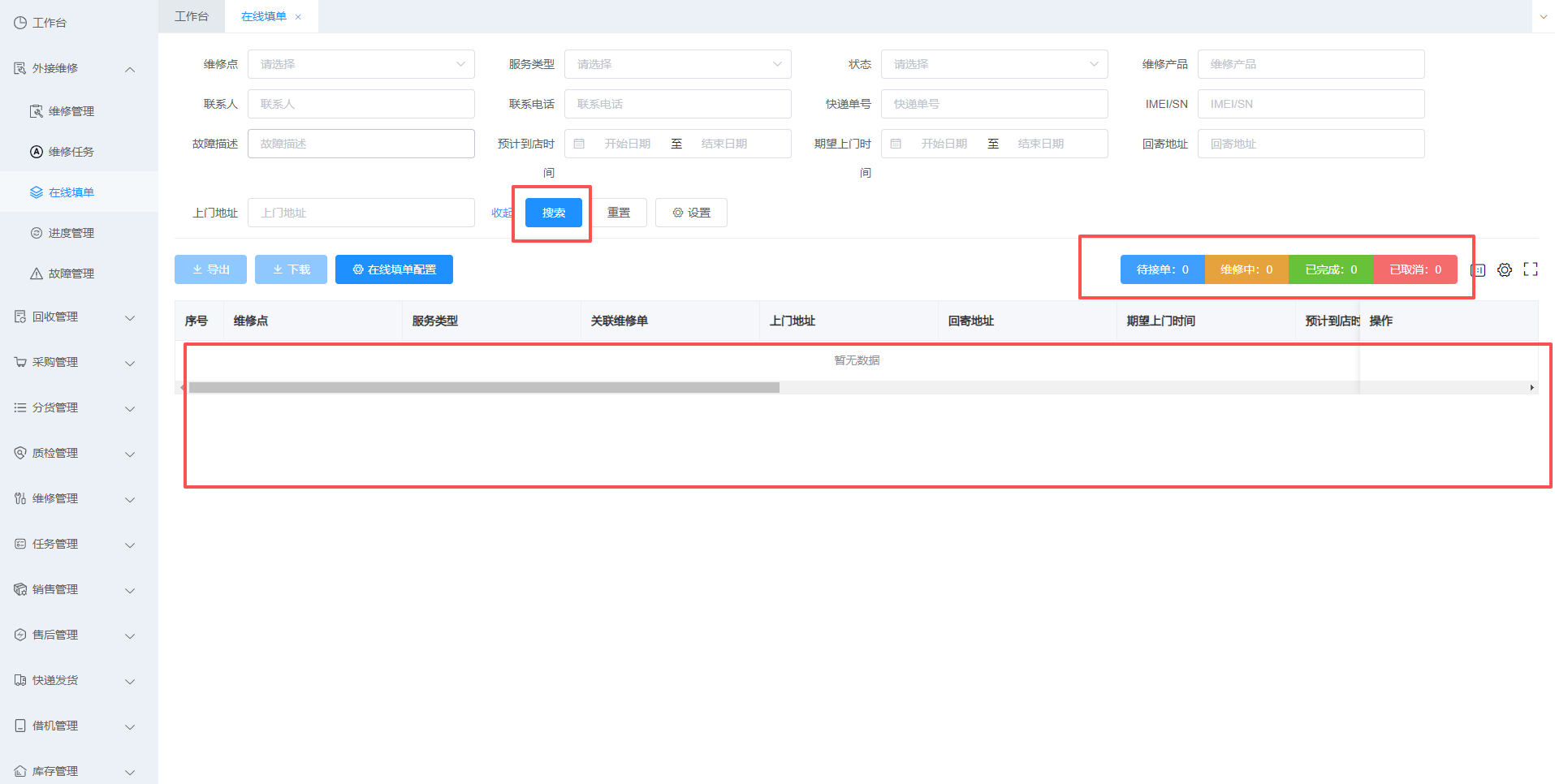 7、维护完成在线填单信息后,客户自主填单后信息都在在线填单页面查看、操作、搜索等信息,如下图所示: