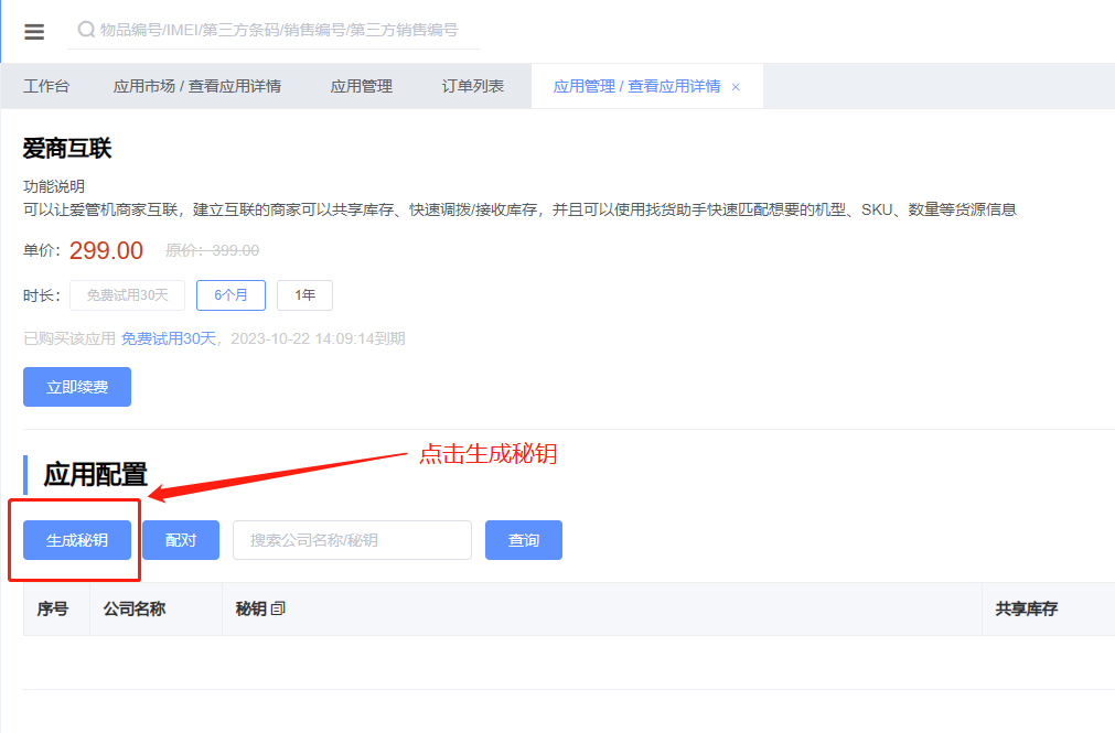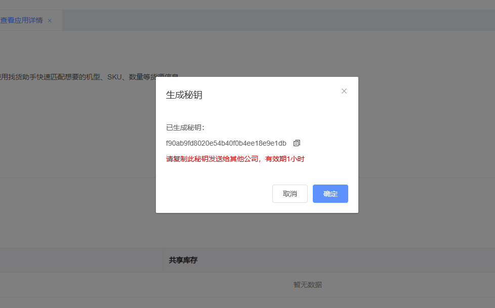2.生成秘钥。点击生成秘钥按钮,复制秘钥发送给想要互联的公司