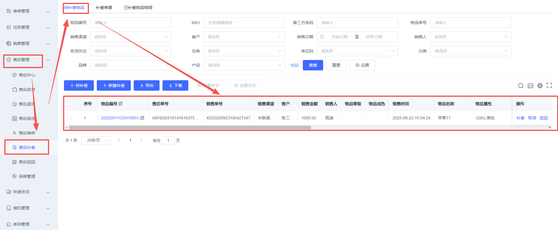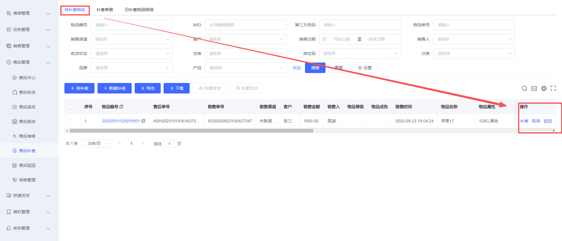 在待补差物品中--扫物品IMEI/手动录入物品信息--找到对应物品,如下图所示: