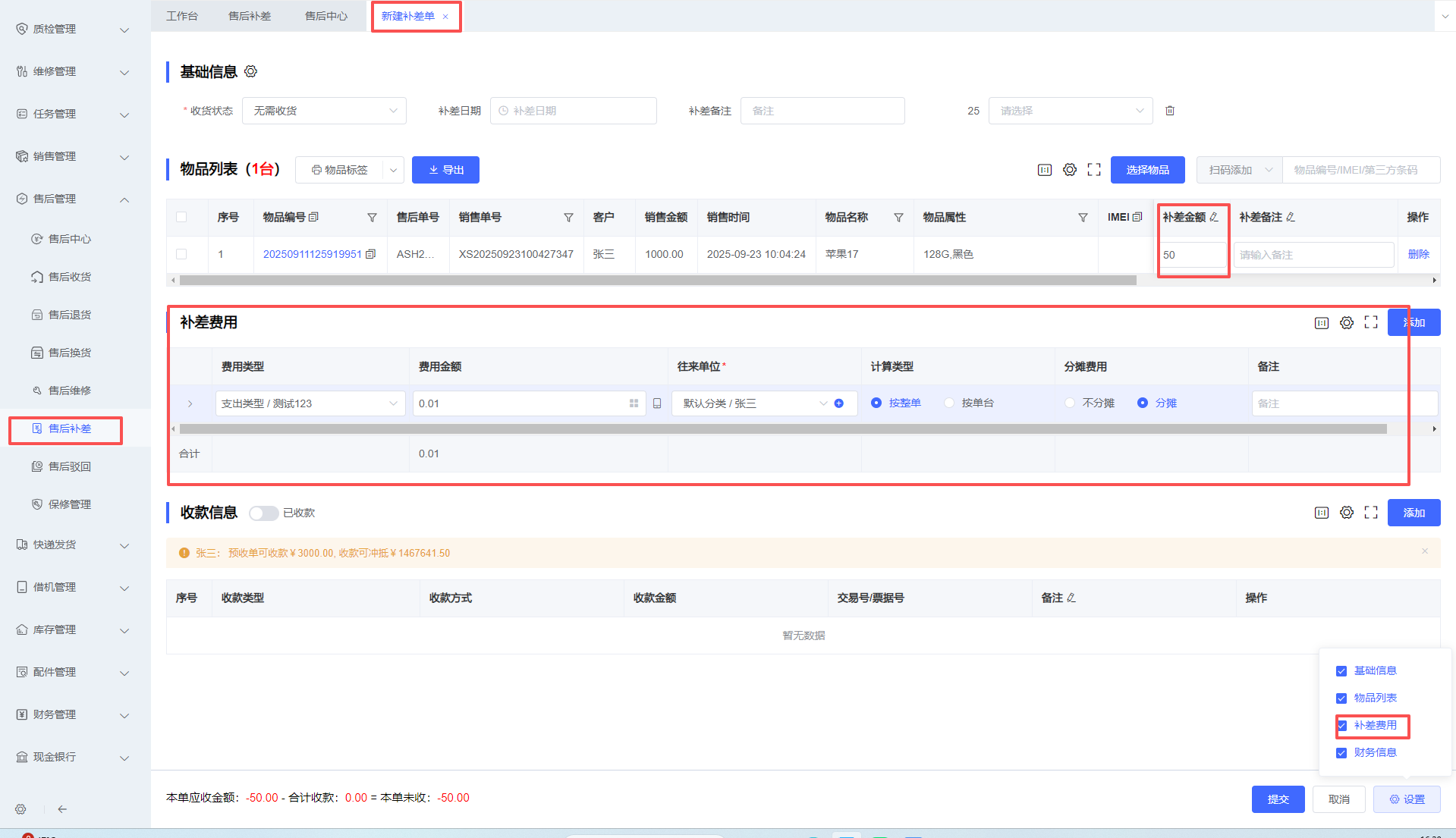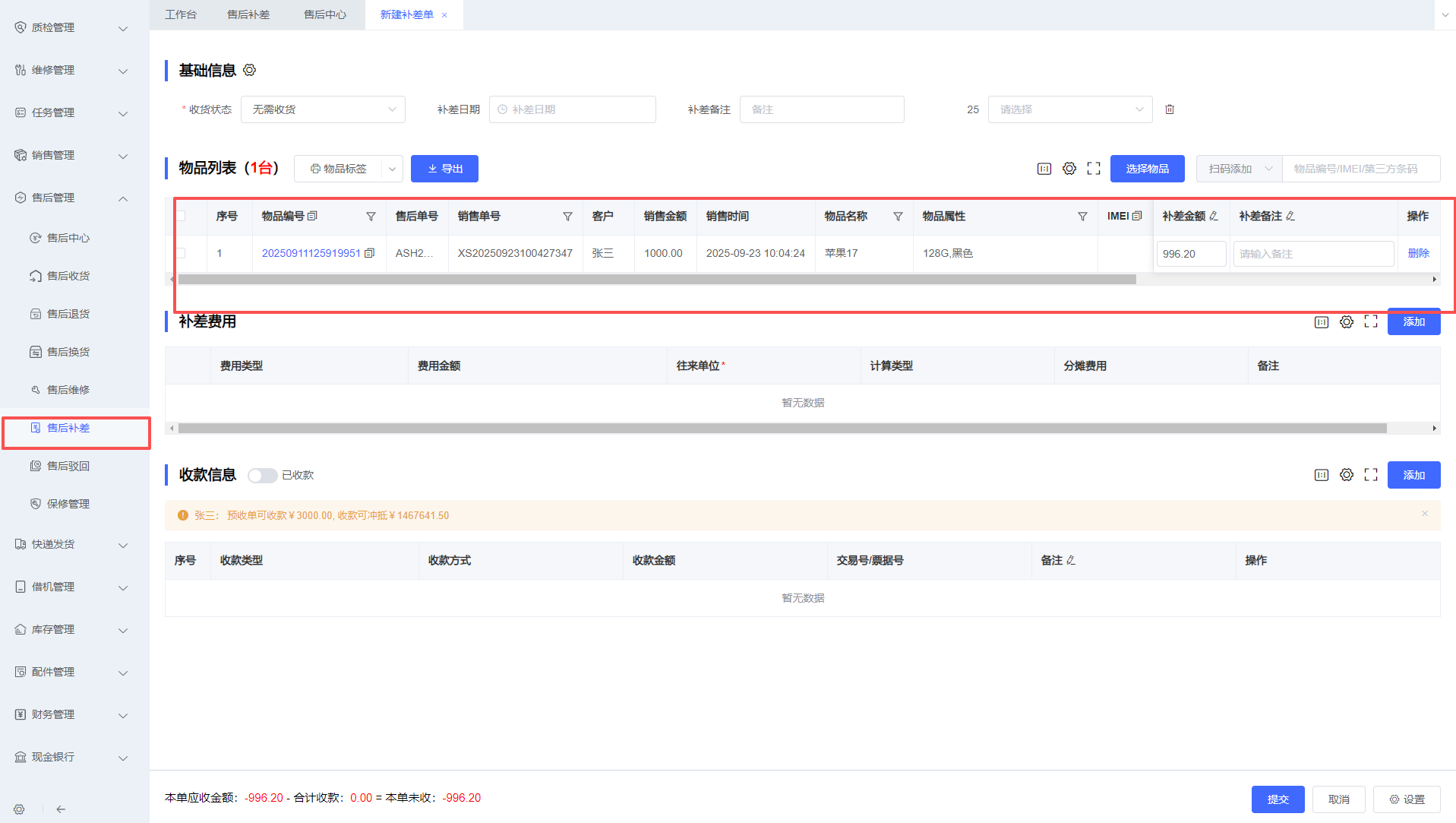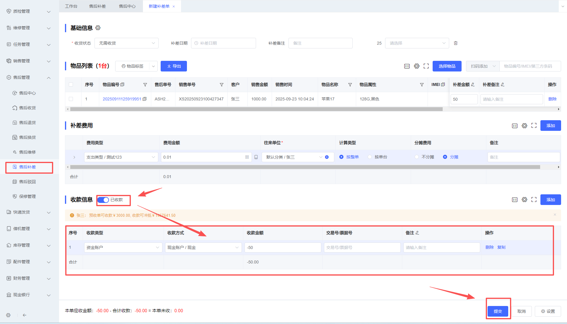6、选填补差是否收款--点击提交--即可完成售后补差单据,如下图所示:
