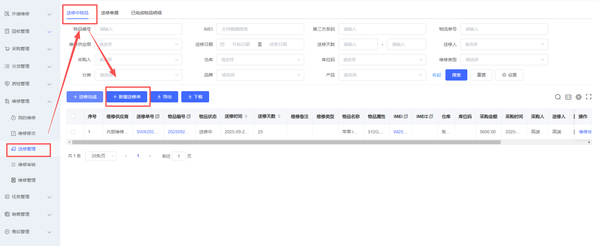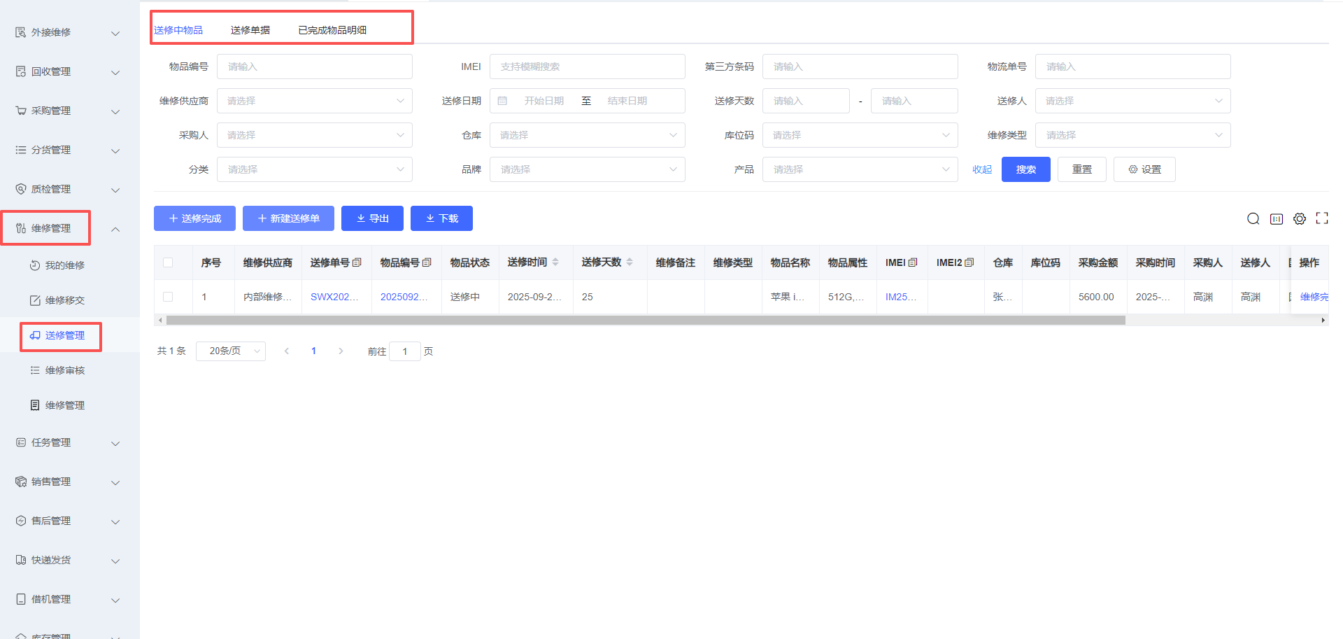 1、送修管理页面主要分送修中物品--送修单据--已完成物品明细三个页面展示送修信息,如下图所示: