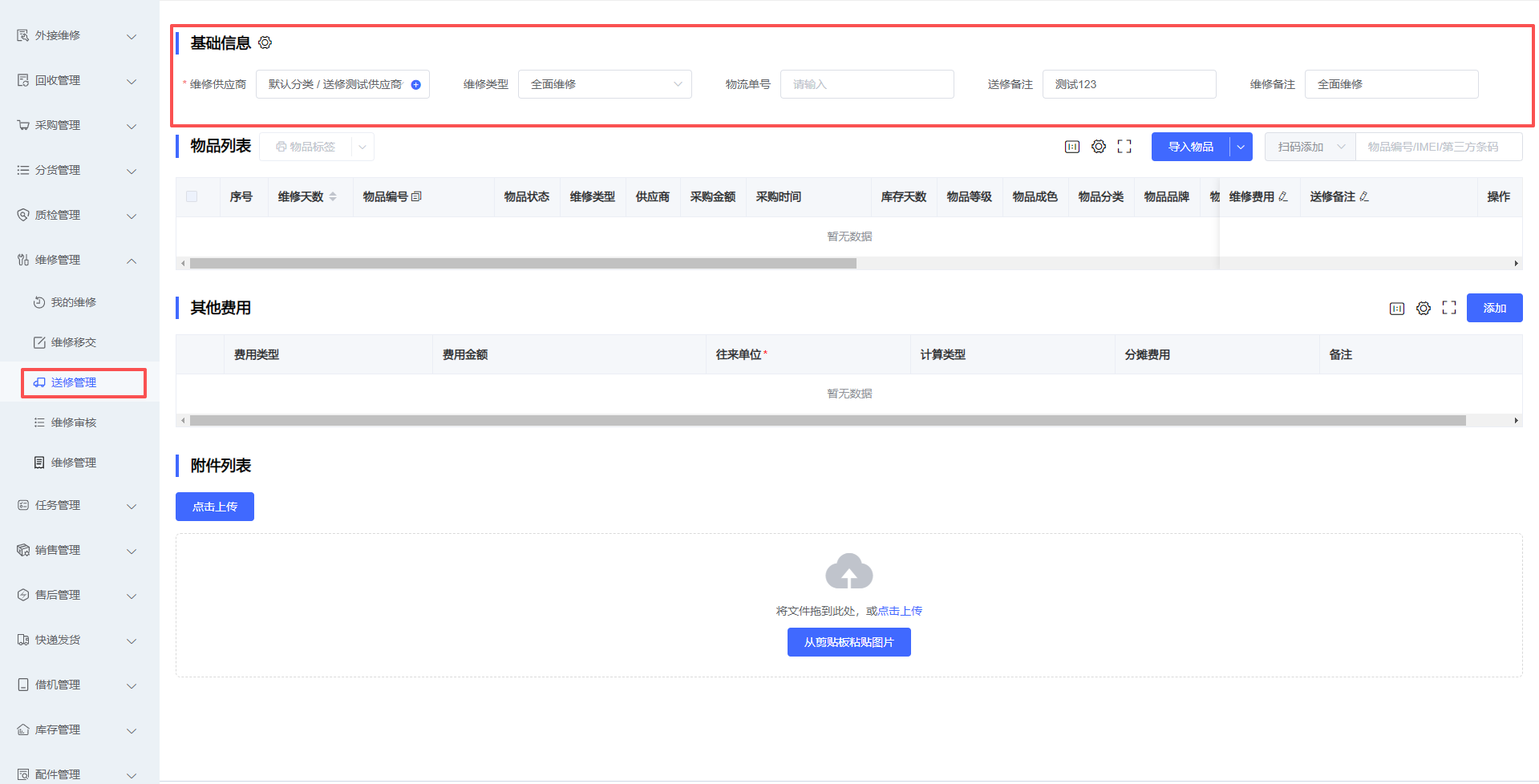 3、新建送修单,首先维护基础信息--维修供应商、维修类型、物流单号(选填)、送修备注(选填)、维修备注(选填)等信息,如下图所示: