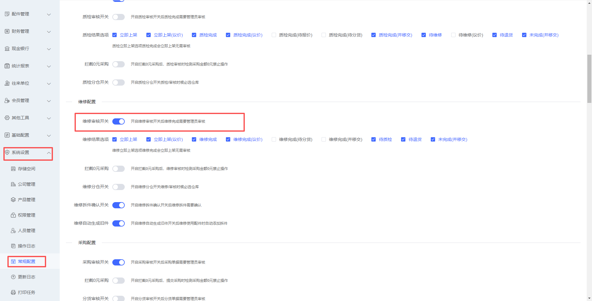 *维修审核需要在系统设置--常规配置--维修配置处打开审核开关,如下图所示:
