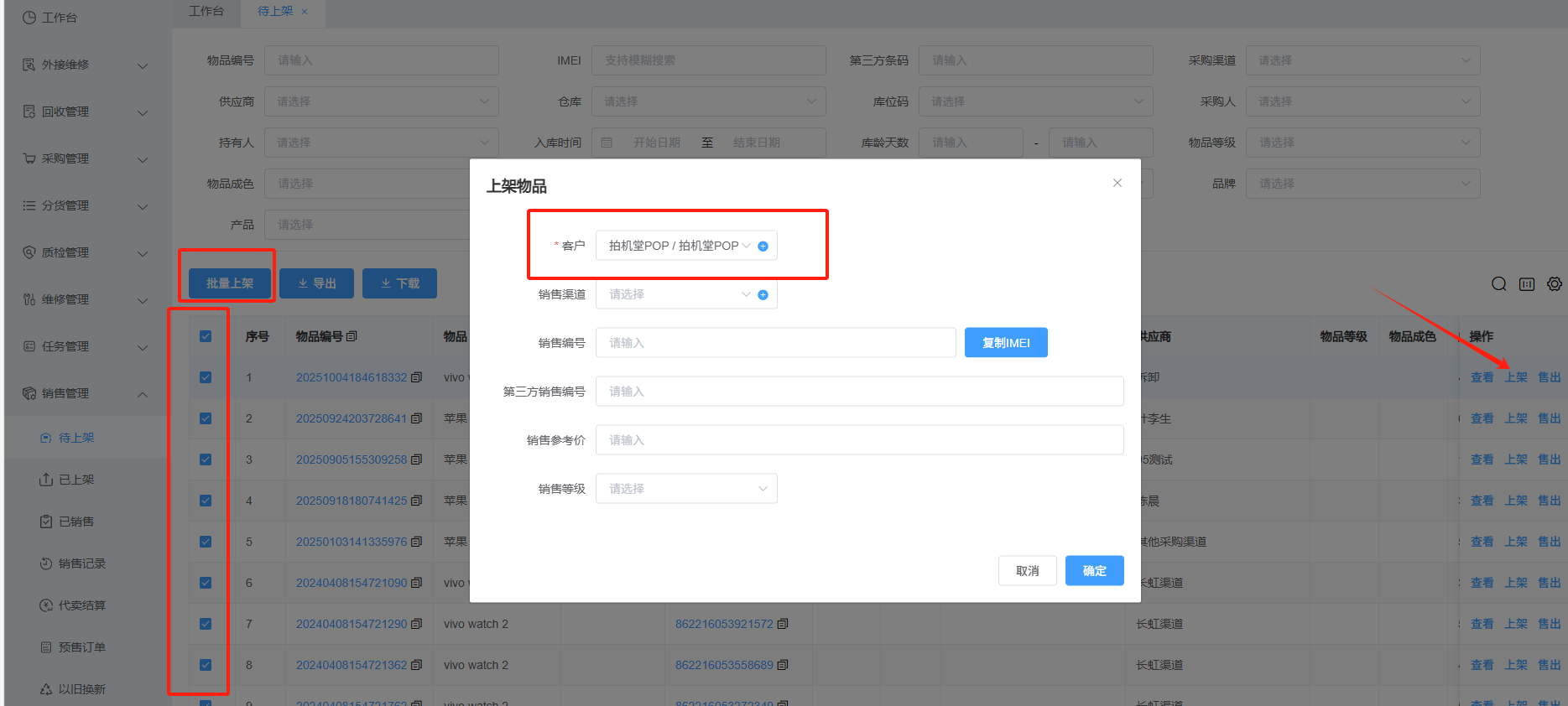 ①销售管理-待上架-勾选上架物品-批量上架 选择需要上架的销售平台(客户)点击确定