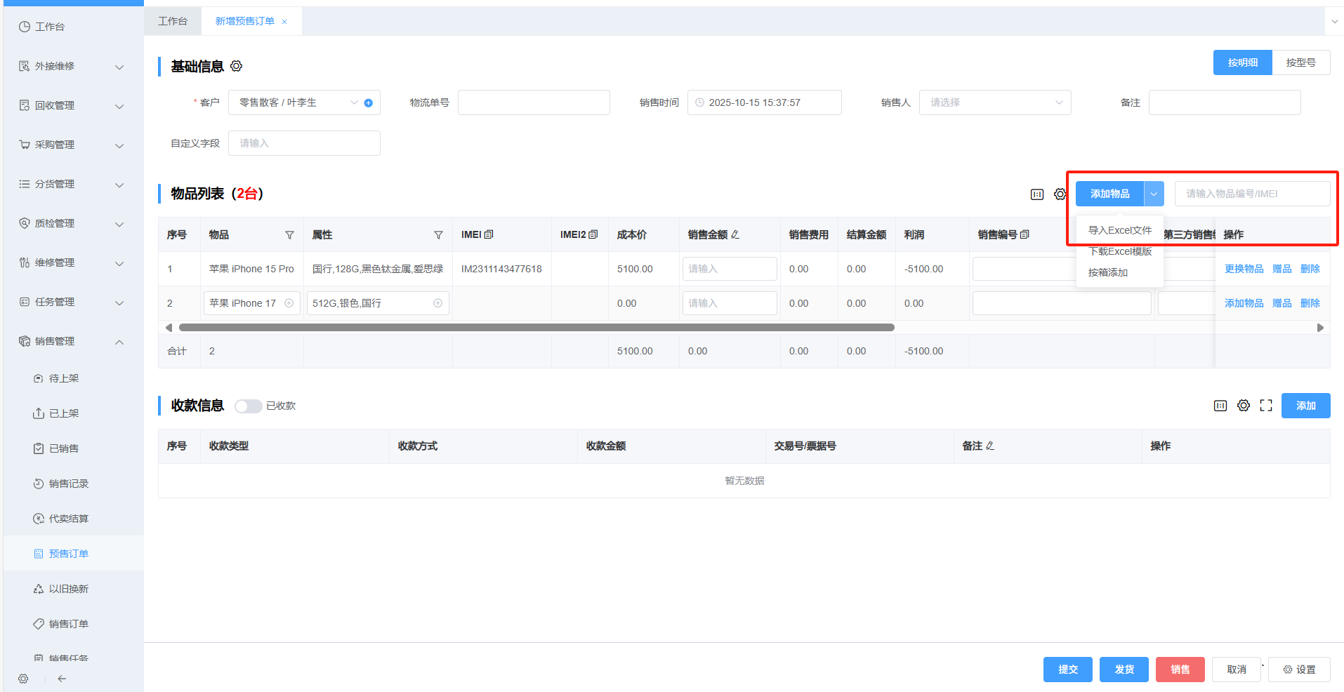 2.3.填写销售单价-选填收款方式预售单收款金额-点击提交保存预售单据预售单(已发货则点击发货按钮记录物流单号信息,实际已出库则点击销售按钮将预售单转为销售单)