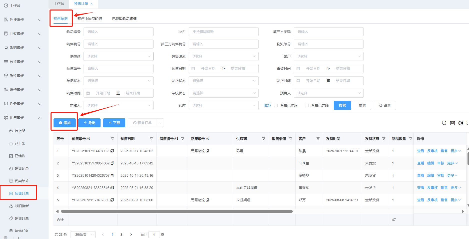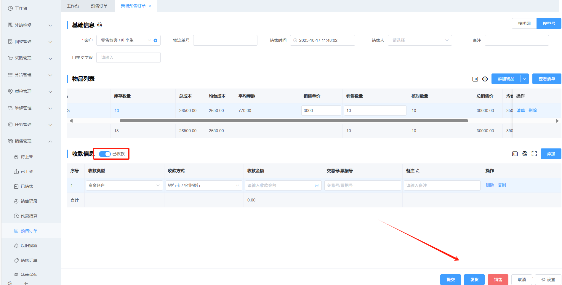 仓库中暂该客户需要买的物品,客户支付部分或全款金额,登记预售预售物品信息,后续物品采购入库,再预售转销售,或将已在库机器给指定客户进行提前预售锁定