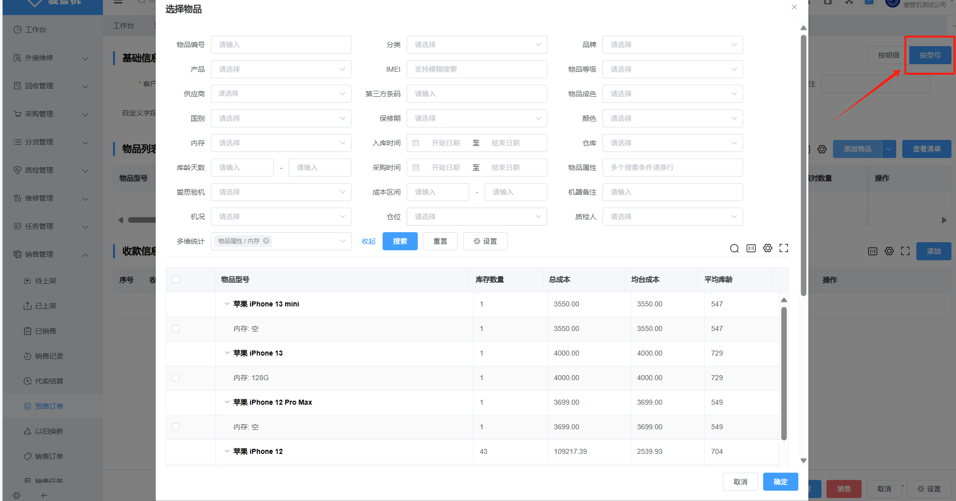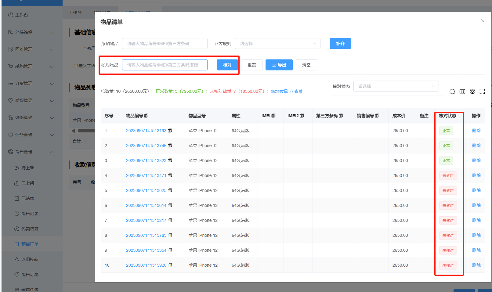 2.2输入销售数量后,点击物品清单可对预售物品进行扫码核对,(如该型号机器在库13台,本次只预售其中10台机器)由于二手数码一机一码的特性,确保添加预售物品与实际机器IMEI一致