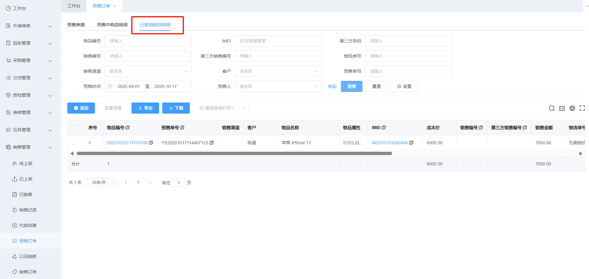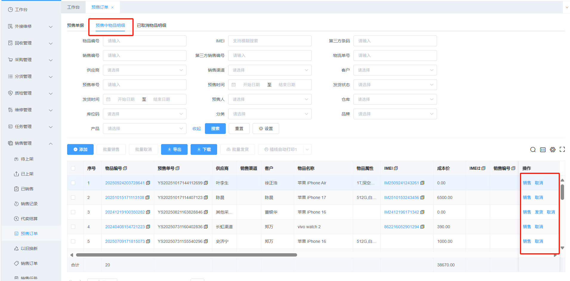3.预售中物品明细展示-可操作对某一笔预收单中具体物品进行取消预售或点击销售 将预售中物品转销售单出库