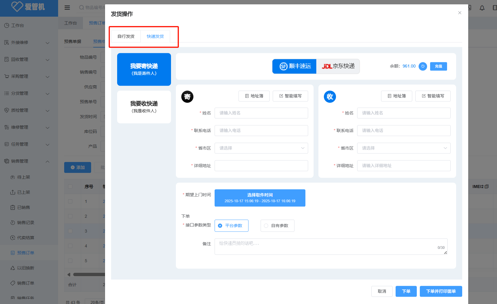 通过物流寄出的物品可点击发货按钮,标记物品发货状态信息,同时支持选择顺丰/京东快递在线下单
