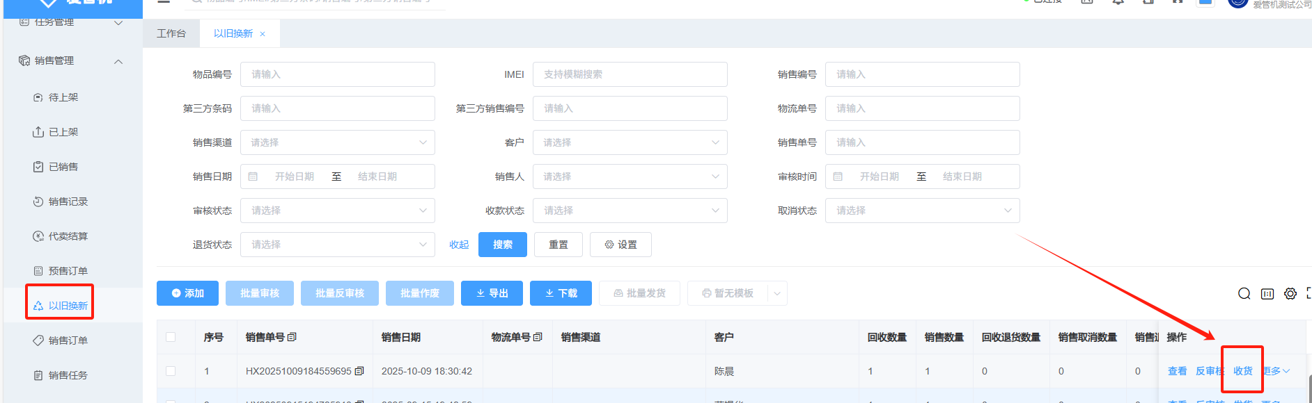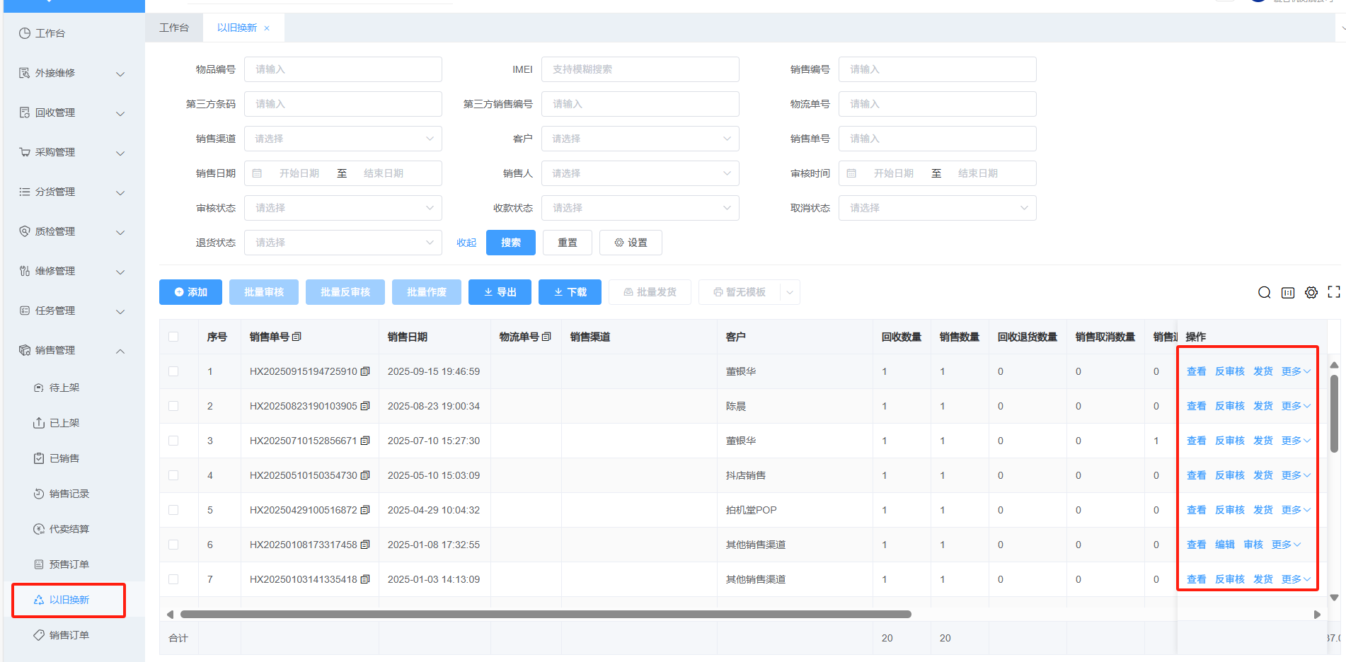 1.点击+添加可创建依旧换新订单 操作栏可对已创建以就换新订单进行反审核、编辑修改销售单据信息