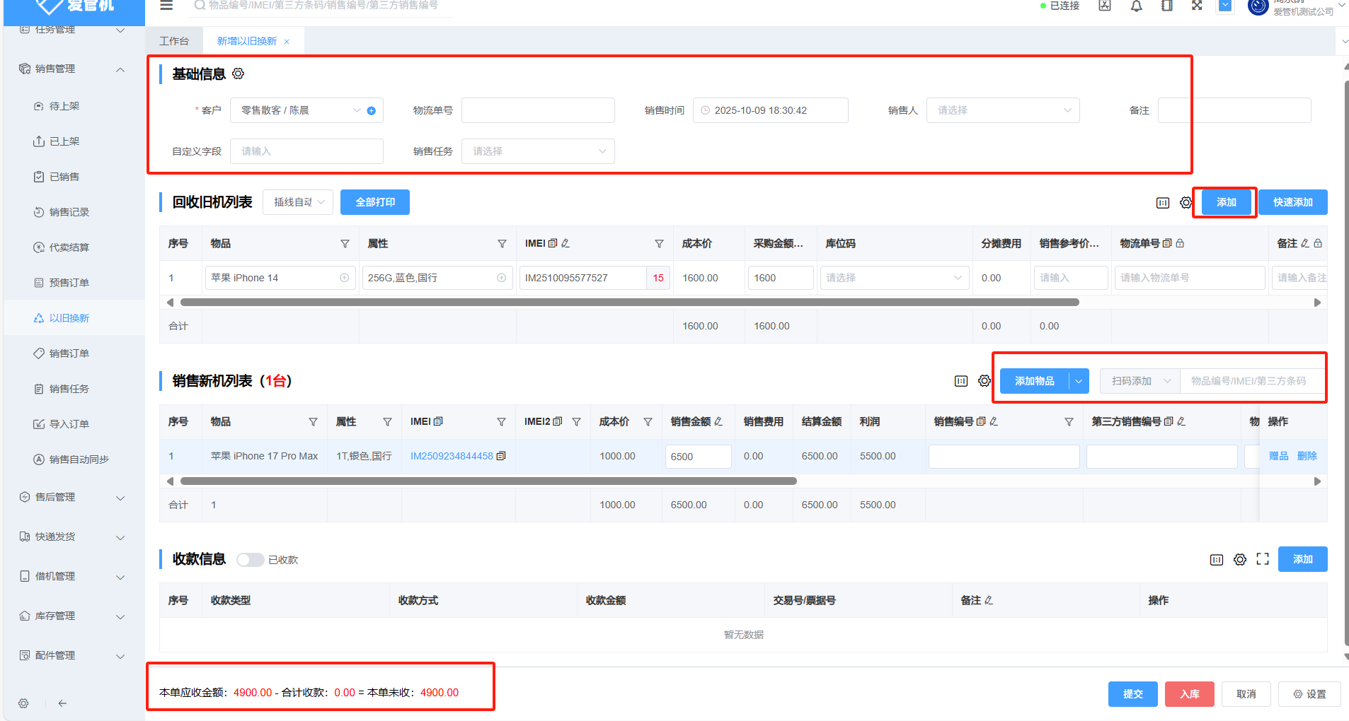 4.销售新机列表右侧可手动或扫码机器标签录入换新机器信息,添加新机销售金额,系统会自动计算本单差额