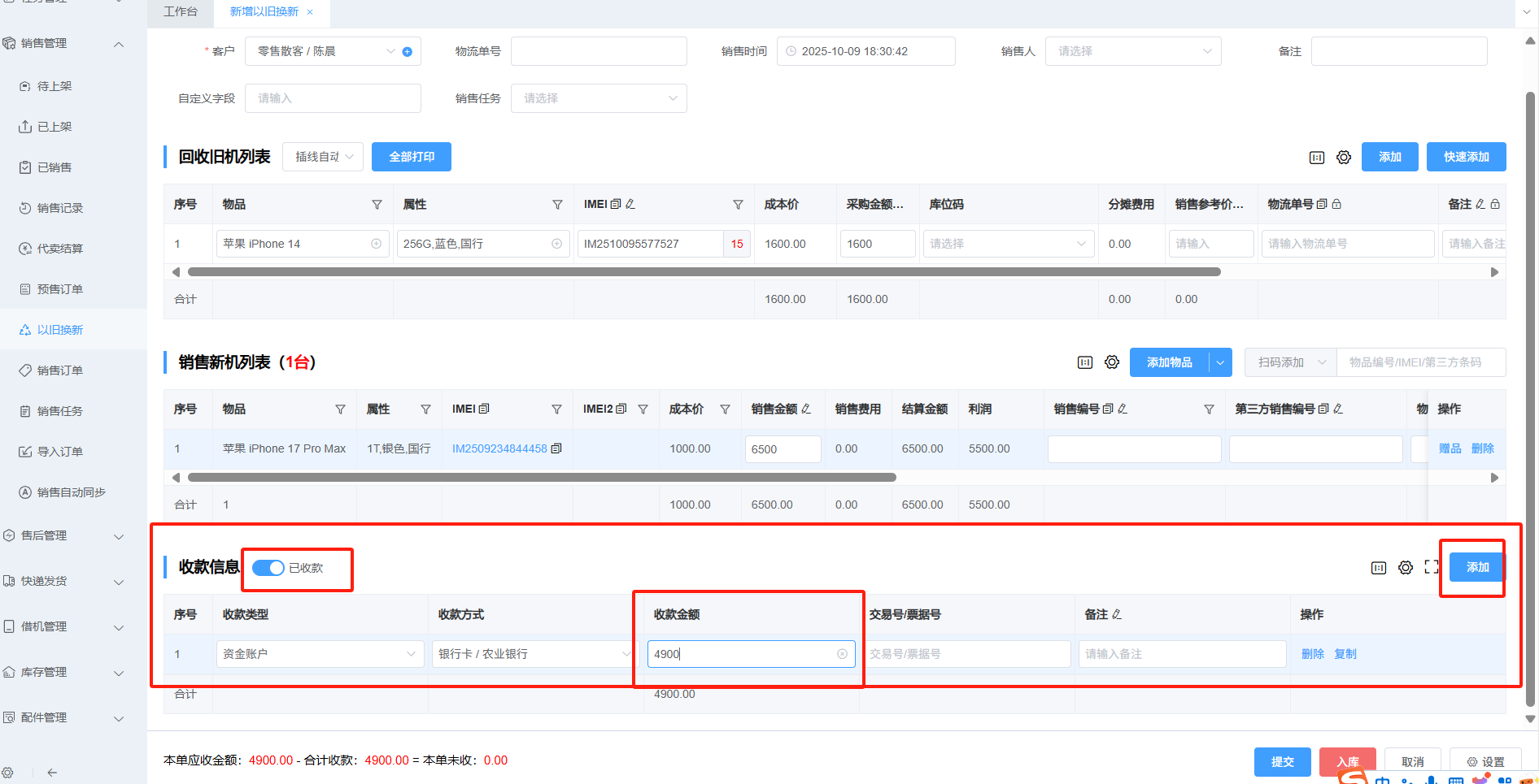 5.新旧机器信息录入完成后,如已经收到客户换新机器差价款,可在收款信息列点击添加按钮,填写收款账户金额